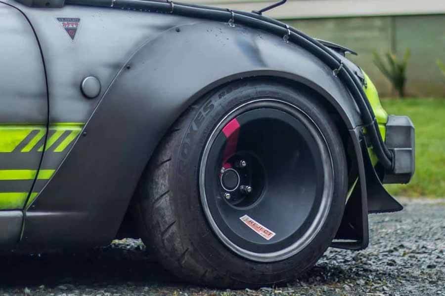 晦暗的灰黑車漆配上亮眼的螢光綠、桃紅點綴凸顯了這種強烈的未來氣息,原先的尾燈、後廂蓋皆被移除,改以細長的橫跨式燈條橫亙其中。上方的鴨尾連接百葉窗造型後窗、及巨型鯊魚鰭翼,甚至在末端巧妙安置了一顆後方顯影鏡頭;巨大的輪拱中則安置了四顆15吋全封式輪圈蓋及輪胎。