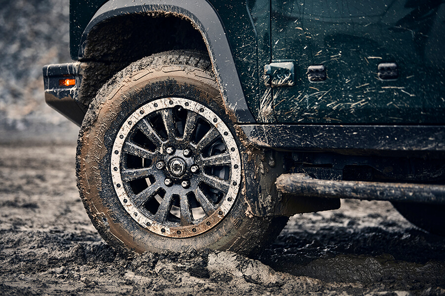下盤功夫非常了得,前後兩端一律採用五連桿懸掛和漸進式螺旋彈簧。17吋鋼製輪圈是標準裝備,買家亦可選擇17吋和18吋合金貨色,三款輪圈一律只有六螺栓格式。輪胎方面,可以在特製普利司通(標準裝備)和BF Goodrich全地形T/A KO2(附加配件)之間任擇其一。雖說裝上小直徑鋼製輪圈的Grenadier很豪邁,但實在很難不去想像配以洛杉磯暗色系的話會有何效果。