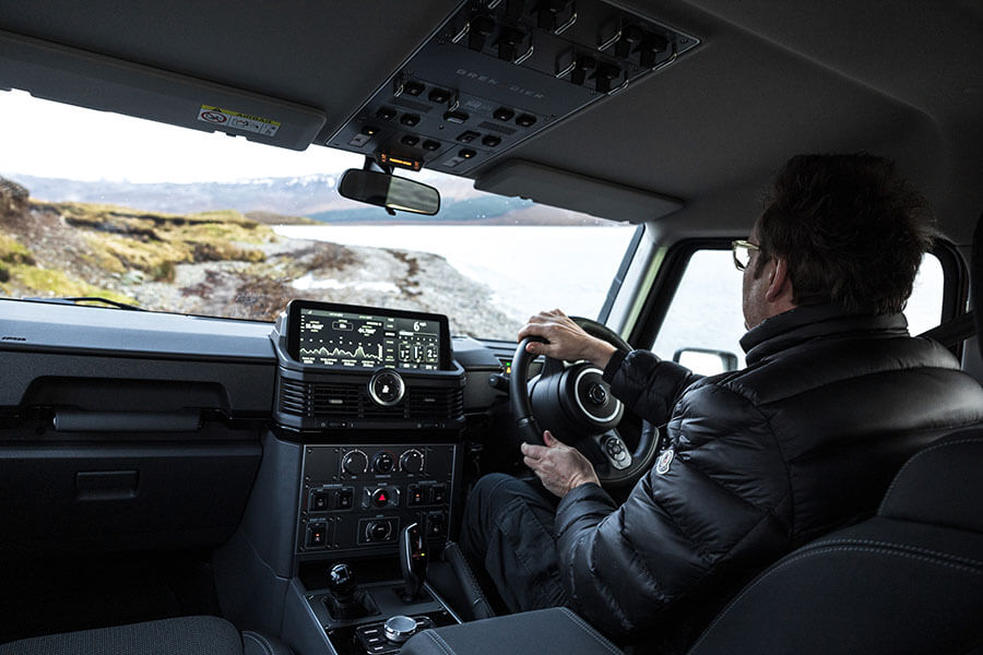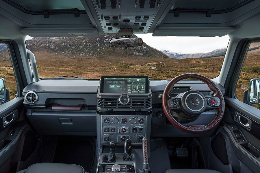 Grenadier大體上奉行類比主義的設計理念在車廂內尤其顯眼。此車推崇大小間距恰當的實體按鈕,而不是把所有功能通通塞進觸控螢幕。冷氣用大型旋鈕控制,警示燈開關設於中控台正中央的條紋底座上,按鈕兩旁還有一對小型金屬欄護駕。