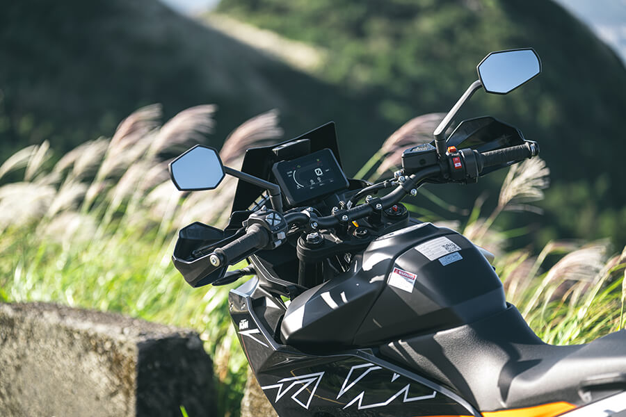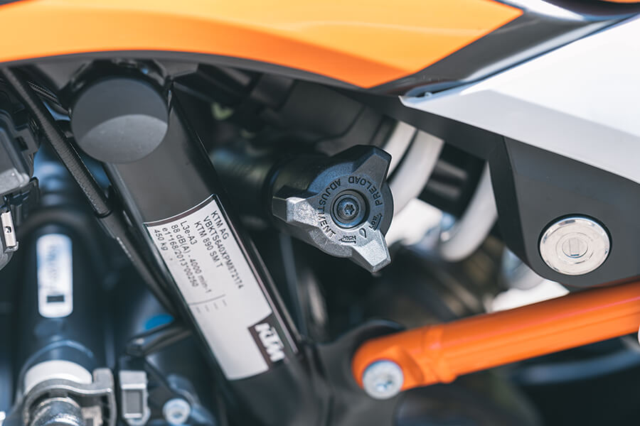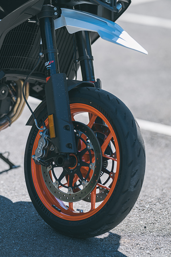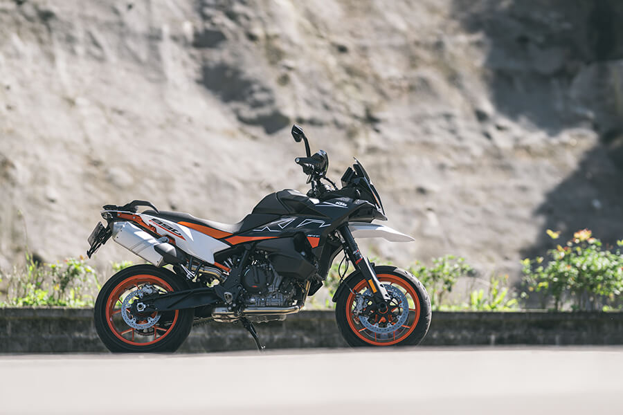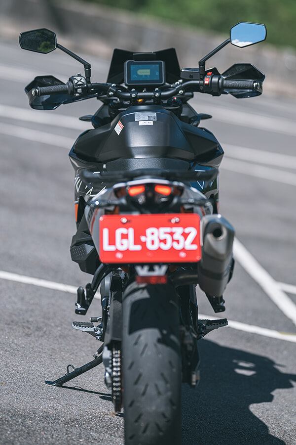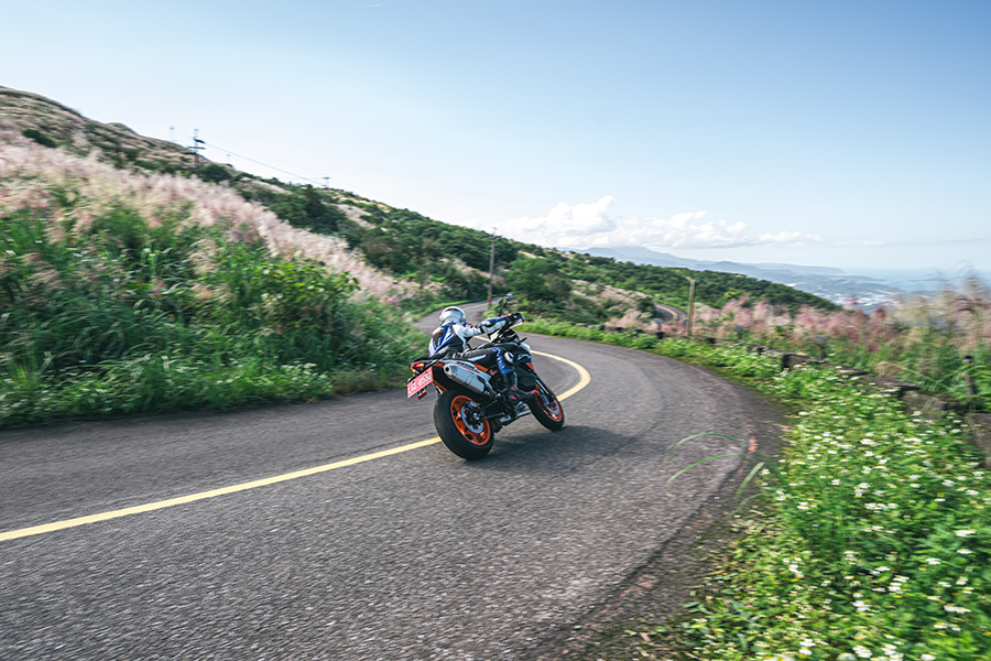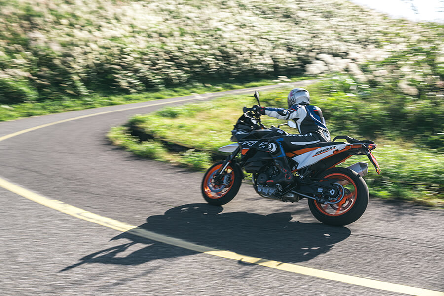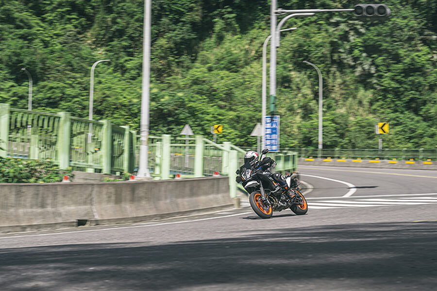 然而腳邊的WP避震也沒閒著,原廠設定的阻尼感受雖硬朗,在高速下通過路面疙瘩時卻能快速排除衝擊、重新將輪胎緊蹬路面,搭配上比起850 Duke略長、又比890 Adventure R略短的軸距則讓車身動態、路線的選擇變得中性而多樣,你可以透過煞車的力道來感受並支配前叉、搖臂與後避震的收縮、擺動程度,再透過身體重心的安排,選擇下一步該如何進行…。這種無論內傾、同傾或出腳外傾皆可選擇自如的感覺真是自由自在、同時又能在大開大闔的油門及煞車反應中,透過感受車輛姿態的變化而輕易獲得騎車樂趣的醍醐味。