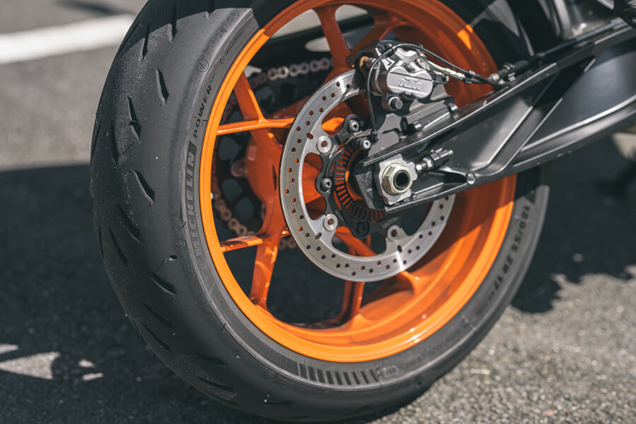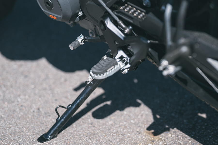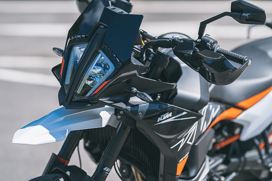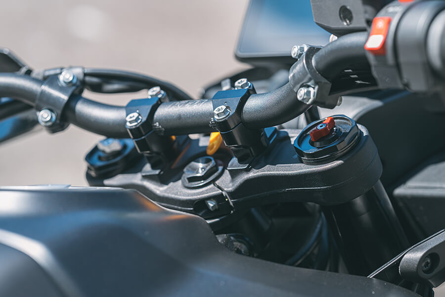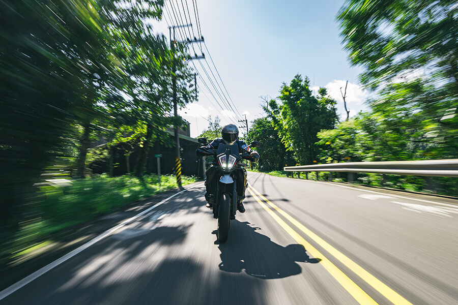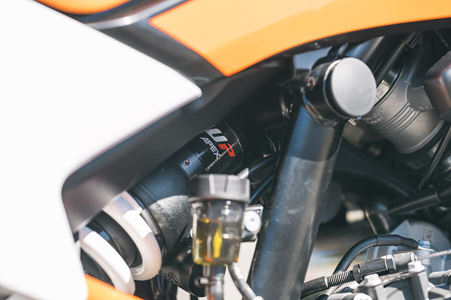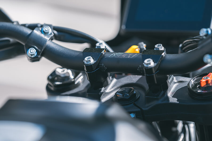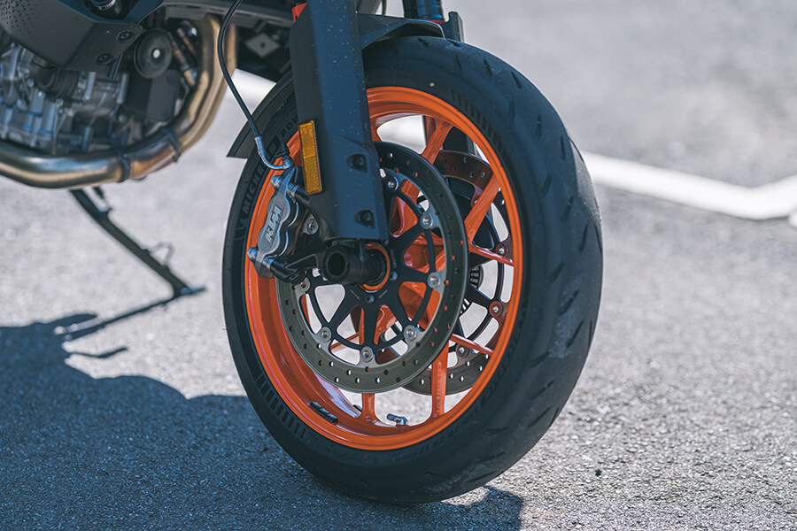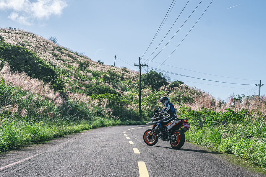 然而腳邊的WP避震也沒閒著,原廠設定的阻尼感受雖硬朗,在高速下通過路面疙瘩時卻能快速排除衝擊、重新將輪胎緊蹬路面,搭配上比起850 Duke略長、又比890 Adventure R略短的軸距則讓車身動態、路線的選擇變得中性而多樣,你可以透過煞車的力道來感受並支配前叉、搖臂與後避震的收縮、擺動程度,再透過身體重心的安排,選擇下一步該如何進行…。這種無論內傾、同傾或出腳外傾皆可選擇自如的感覺真是自由自在、同時又能在大開大闔的油門及煞車反應中,透過感受車輛姿態的變化而輕易獲得騎車樂趣的醍醐味。