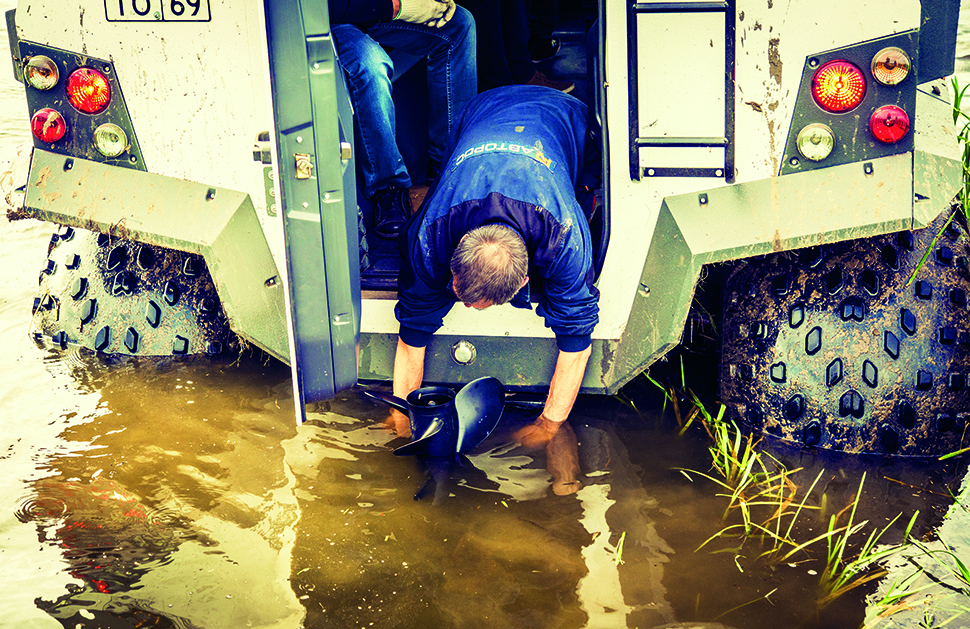 一待車尾高高翹起,那個本來有點搖搖欲墜的推進器便掛接到車尾上,讓司機透過Shaman的控制介面直接控制,看起來活像一個礙於成本唯有事後添加的裝置。我們得繼續滑進水裡,直到車輪最終沾不著地的緊張一刻,重量相當於兩部Discovery的物體就得靠自己維持浮力。