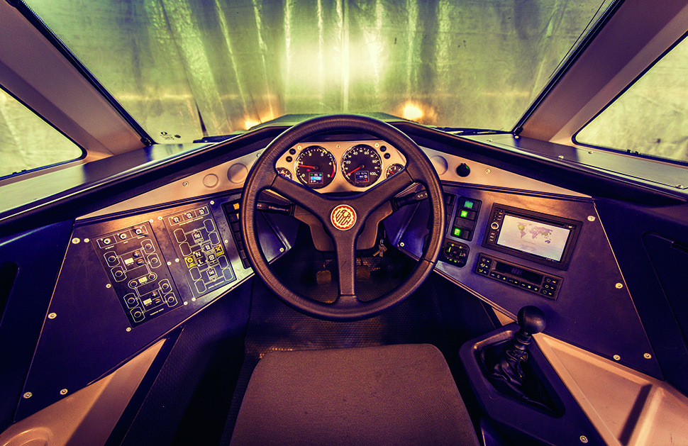 方向盤左邊的控制板則要略花時間適應。板上有一大堆按鈕用於逐一解開或鎖上四根車軸,以便Shaman在異常陡峭的斜坡上行走;另一堆按鈕則用於使喚那個Vladimir最引以為傲的自家開發成果-四輪轉向系統。