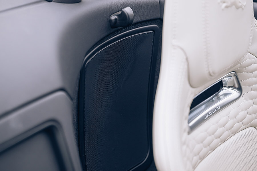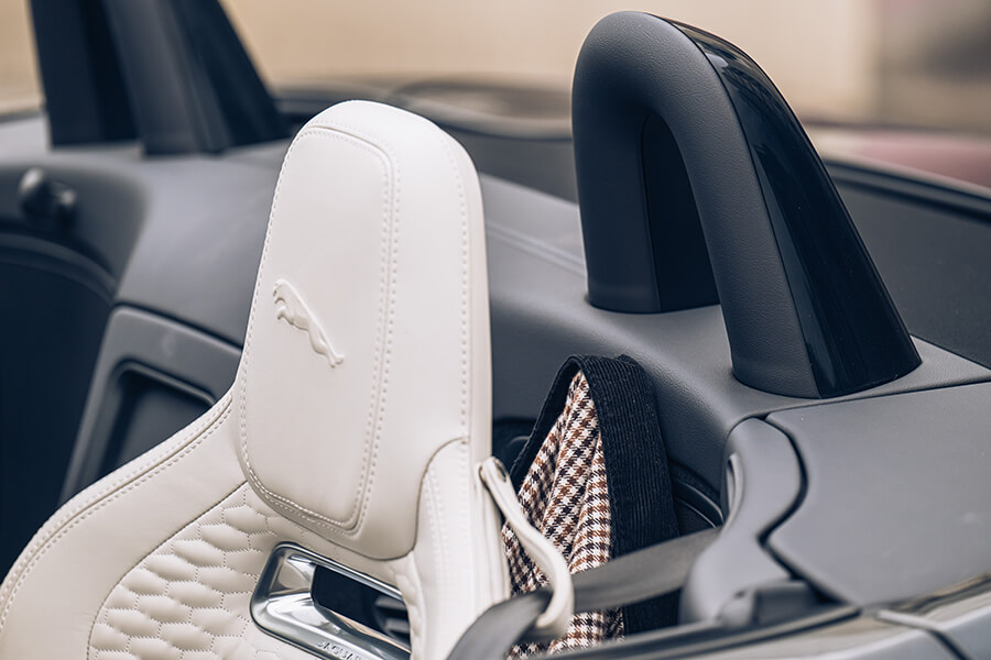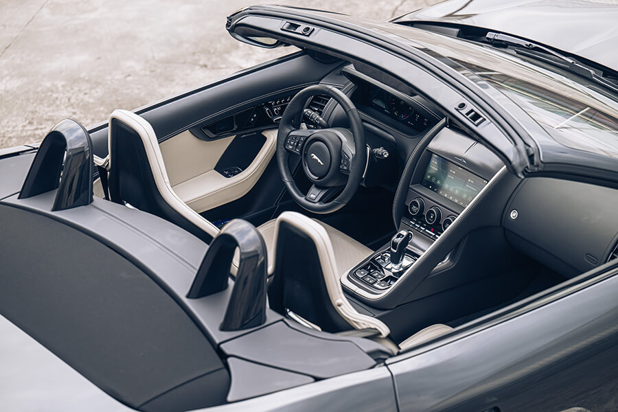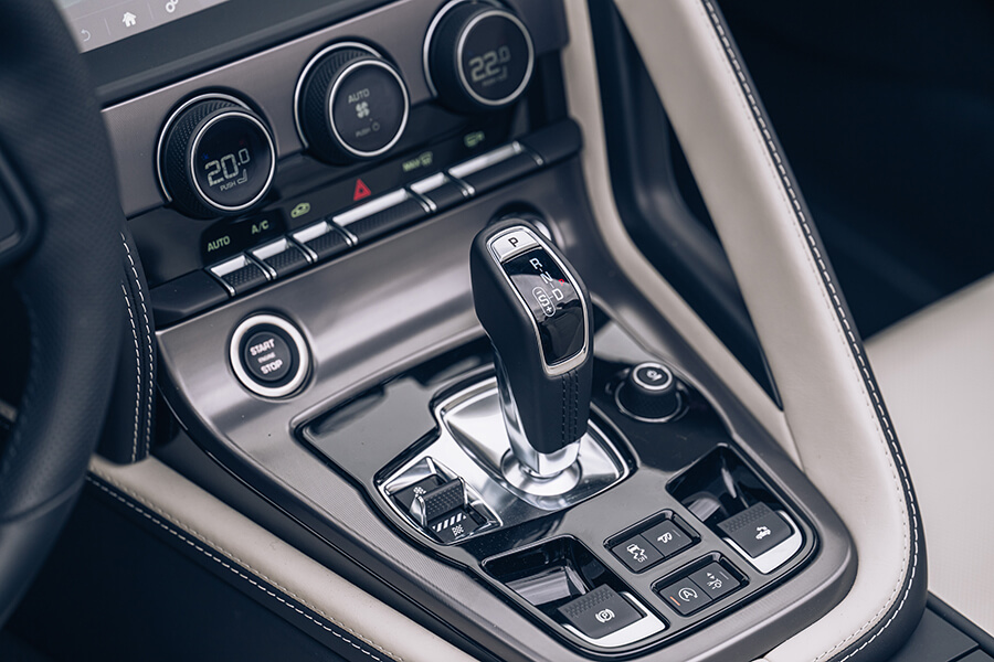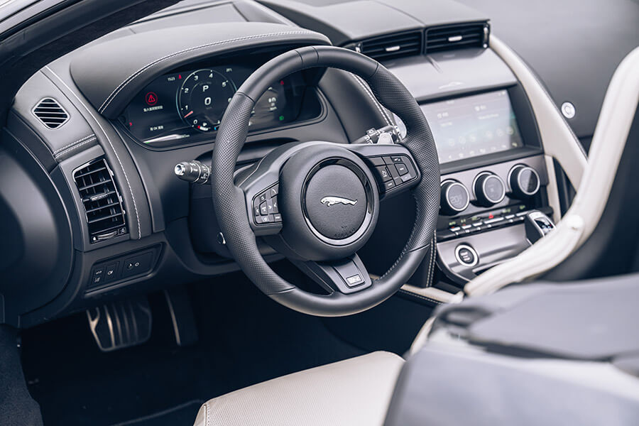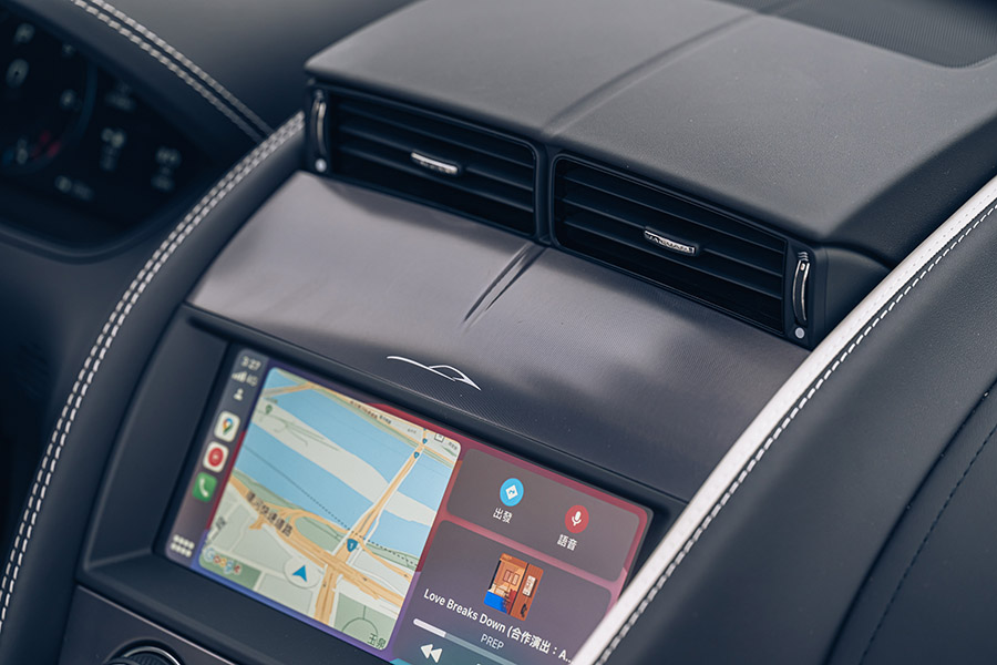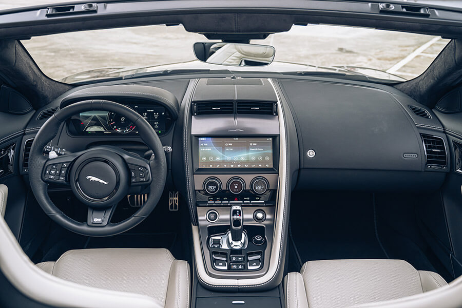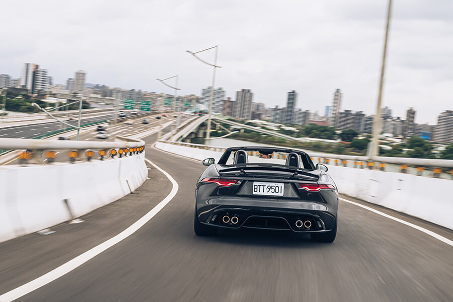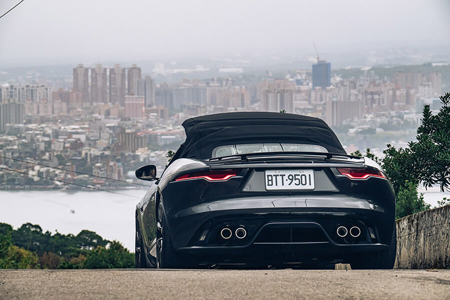 開門、一腳跌進淺牡蠣灰色溫莎皮革鋪陳的低矮車艙, 我與前方路面視野相隔一副12.3吋數位儀表、以及窗外環伺的性感車頭曲線。此情此景下以這一身兩米寬車身與長長車頭,躋身上班尖峰車潮尚未消化完畢的台北市區著實戰戰兢兢,幸好關棚狀態下的F-Type具有一定隔絕表現,儘管免不了些微的風絲聲響穿堂入室,亦無妨我透過Meridian音響,讓一些輕快、迷幻且帶著憂鬱氣息的英式City Pop音符充盈在這軟棚下的方寸之地。"你有開閥門嗎?剛剛的排氣聲很兇捏~"在完成一段拍攝後,攝影Jackal自外探頭問道。疑,沒有啊…,車內的我怎麼就渾然不覺呢?不過這也提醒我嘗試把玩圍繞在排檔桿周圍的一些有趣按鈕,打開閥門、按住開棚鈕,十來秒過後我便沐浴在整片天空、以及陣陣V8聲浪當中。