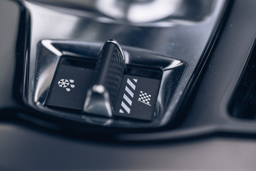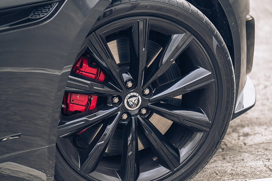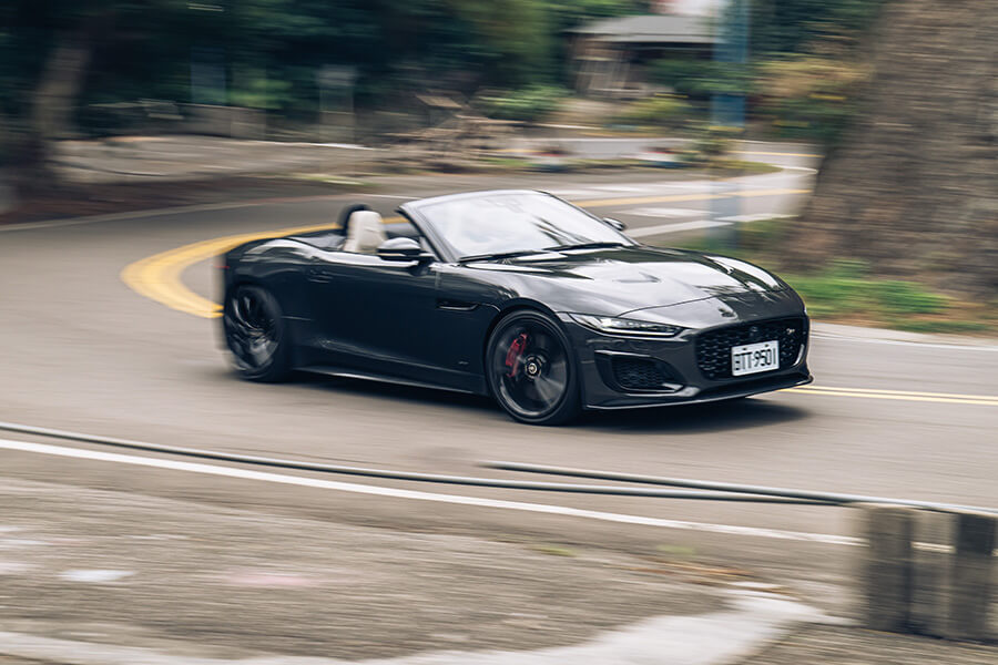 但與F-Type在都會水泥叢林間再怎麼駛都總覺得有志難伸,一腳踩離市區,很快地就在後照鏡裡看到了自動升起尾翼上的黑色豹徽,此時的高速體感與震動卻依然穩若泰山,彷彿達成這般速度完全不是啥困難事。溜下交流道、切入S檔及賽道模式,拉轉起來盪氣迴腸的十字曲軸聲響和著前方機械增壓的「咻~」吸氣聲不斷撩動感官,掌中方向盤的手感既紮實卻又令人可以轉得從容優雅。只不過當重煞入彎時,制動力道面對近1.8噸重的車身所帶來的減速度顯然有些力有未逮,為此Jaguar其實也提供了要價72.3萬的碳陶煞車套件。不過在這套煞車如今並不在身邊的同時,煞車點的抉擇就得好自為之…不過在習慣這一點之後,車上鋁合金懸吊所賦予的簧下輕量化工程在智慧四驅系統的引領下輕易溜入彎心;當迴旋、再開油,前265、後305mm的P Zero配胎又在做出車尾下沉的姿態後為抓地力及車身動態作保。過程中給予的信心與側向G力之足令我一再提早並加深出彎的油門。當車尾終於在極限下產生些許滑動時,動態亦相當和緩漸進,下意識輕柔收回舵角及動力即可將後輪重新領回正軌。