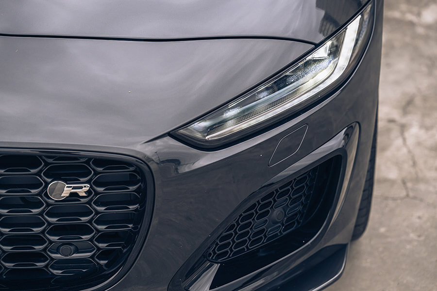 筆者自孩提時期家中就有一輛1:18的敞篷E-Type模型、同時俯視歷史,我所心屬最兼具風韻與競賽氣息的英國車則非D-Type莫屬。在今朝正式成為Jaguar燃油跑車關門弟子的F-Type其實沿襲了上述祖輩相同的身段,各位真的得看看在這陰天所透出的均勻日光,在鋁合金引擎蓋、車體腰身、後葉子板的隆起,以及僅在敞篷車型中得見、那簡短卻精采的後甲板表面曲線下所呈現出的光影,多嬌之餘卻又比起奔放的義大利車添了一分內斂含蓄。儘管個人私心更愛小改款前更具古典美的車頭樣貌,不過細長的Pixel LED前大燈顯然與後方設計首尾呼應,加上下緣兩道日行燈條的勾勒、與喀爾巴阡灰金屬漆的烘托下,格柵內橫眉豎目的黑化美洲豹形象彷彿在車頭隱然成形。