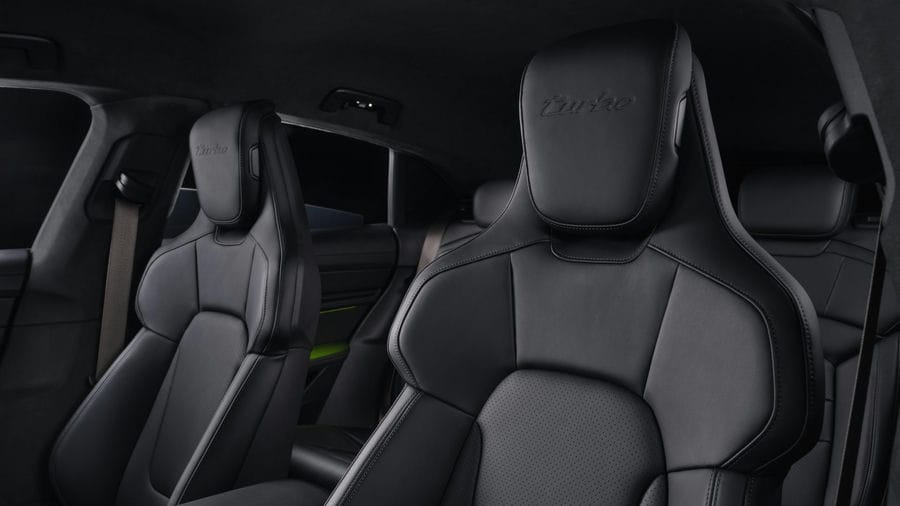 全新 Taycan Turbo 和 Taycan Turbo S 的頭燈採用具有精細光學元件的高解析度 LED 矩陣式頭燈技術,在夜間能夠凸顯出保時捷標誌性的四點式頭燈。在車尾光條中的保時捷 Logo 具有立體、透明造型,並且首度提供具有迎賓/離車動畫的發光版本作為選配。除了其他顯而易見的特點之外,渦輪黑色調使 Turbo 和 Turbo S 車型的外觀與內裝都比其他版本更具特色。