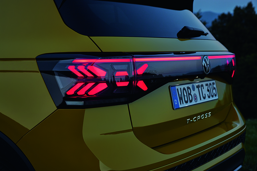 The new T-Cross 繼預售車型 230 TSI Tech 和 230 TSI Style Design 後,驚喜揭曉 230 TSI Life 車型,完整全車系編成,同時推出新車色淨霧藍和日耀黃,彰顯獨一無二的清新風采,外觀承襲一貫亮眼潮流風格,車頭下方搭配黑色下氣壩,邊框綴有銀色鍍鉻飾條,兩側妝點斜偏菱形 LED 獨立式日間行車燈,打造時尚運動外型;230 TSI Tech 以上車型,擁有黑色格柵式水箱護罩連貫式 LED 定位燈,更首度配置 IQ.LIGHT 智慧燈組:LED Matrix 矩陣式頭燈,含全天候照明燈(附角落照明功能),視覺迷人又大幅提升安全性,車尾有 LED 3D 視覺貫穿式尾燈(附動態轉向指示燈),無論是煞車、轉向,或倒車,燈型皆會隨之變換,獨特且方便後方駕駛識別;230 TSI Style Design 車型則享 Style Design 專屬套件,包含 18 吋 Koeln 鋁合金輪圈、Style Design 專屬黑色後視鏡罩、Style Design 專屬後方深色隱私玻璃,展現個人獨到品味。