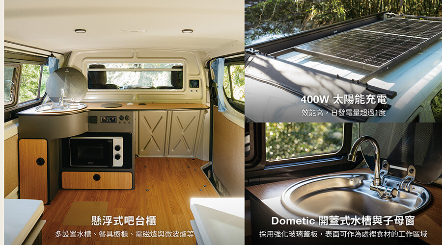 為進一步提升消費者體驗,亦提供「升級配備」選擇,如懸浮式吧台櫃、子母窗、400W車頂太陽能板,還有直流電瓶駐車冷氣、平台式微波爐、電磁爐等配置,使HIACE露營車成為一個充滿創意、靈活度極高的行動居所。