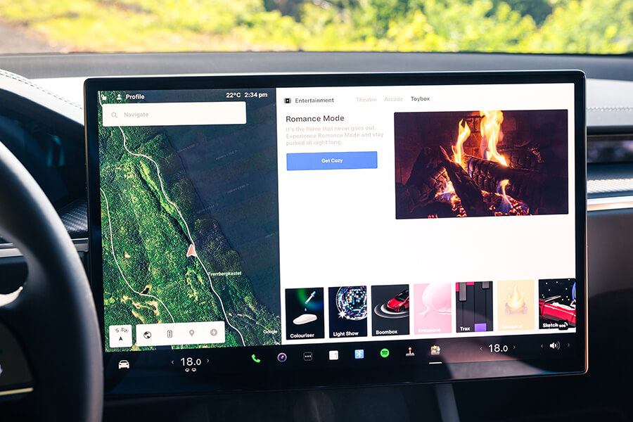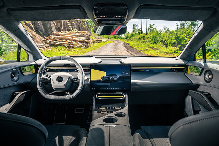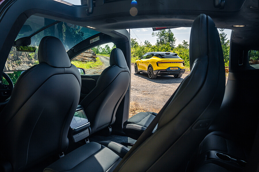 另一角落的蓮花便比之熱鬧得多,不但有多個螢幕(包括駕駛者、乘客專用資訊螢幕和中央觸控螢幕),材質紋理和形狀亦比較多樣化。相對於特斯拉的平淡氣氛,蓮花無疑較為多姿多采。奇怪的是一旦置身其中,並不會覺得複雜難用。為常用功能設置實體按鈕便是一個好心思,物料(許多都是循環再造的)和品質亦很出色。坐位可以選擇四或五座,空間感覺上不如特斯拉寬敞,主要原因出在擋風窗扁斜和車身整體高度較低。所以這方面的取捨有點關乎個人喜好和需要,特斯拉的設計勝在寬廣簡潔,蓮花則較為體貼有趣。