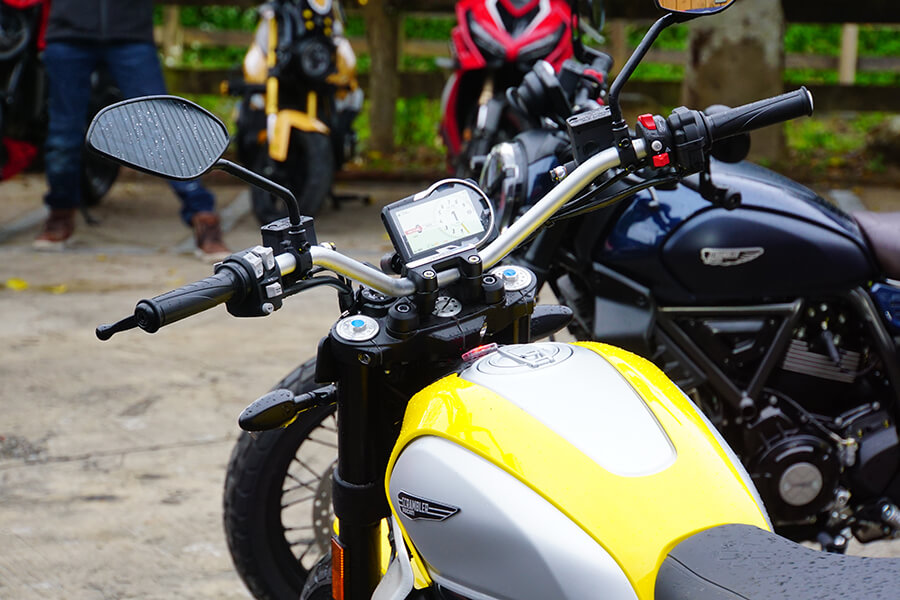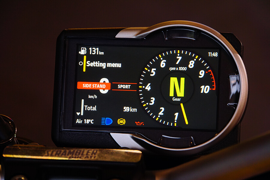 容小編在此為您介紹最新的Scrambler :在進行大幅的軟硬已更新之後,首先就可以看到其儀表從圓形液晶改為全彩TFT,開機動畫之流暢絲滑簡直令頭回扭開鎖頭的小編嘖嘖稱奇。4.3吋的面板裡大大方方顯示車速、轉速、檔位等必要資訊,夾在中間的行車模式字樣暗中悄悄提醒:此車有著電子油門。在間單的兩個模式當中甚至可以透過進階選項,按照喜好配置四段循跡模式的介入程度。