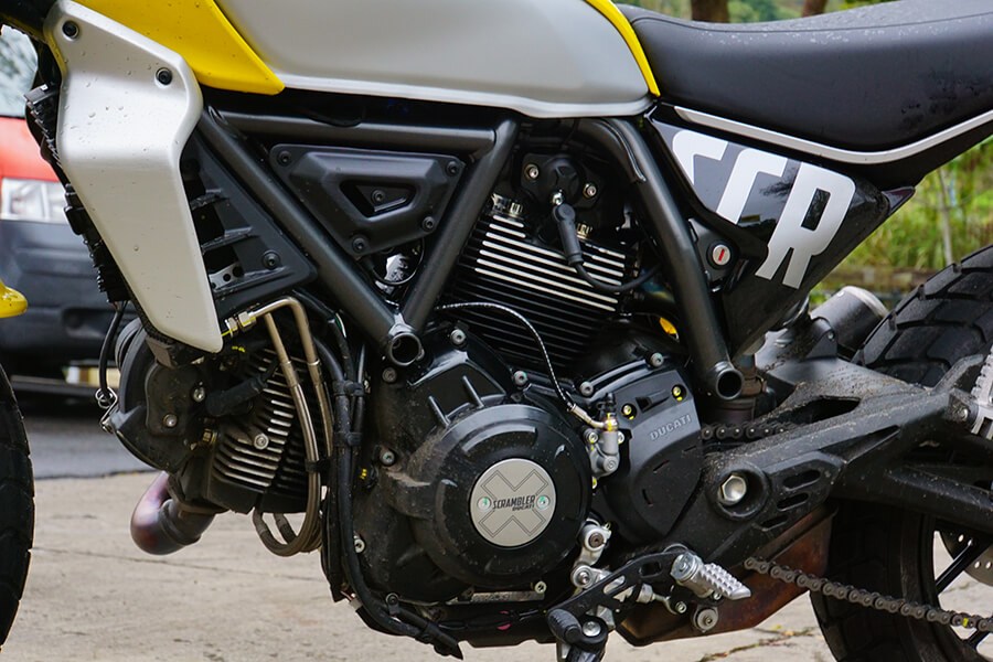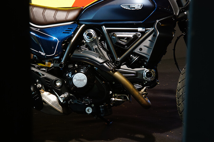 經過更新的主車架安放著73hp/8250rpm、6.7kgm/7000rpm的803cc Desmodromic二汽門Desmodue引擎、副車架亦採可拆卸設計,而後避震也顯而易見地換了個位置擺放、搭配輕量化的後搖臂(當然也經過重新設計),藉以提升做動時的安定度,藉由這次重新布局,也順勢讓新款Scrambler車輛乾重輕上了4公斤。至於變速箱的改變亦不僅止於那副精巧的外蓋:固定軸承的變速轂、輕量2.5kg的8片式離合器加上DQS雙向快排,使得進退檔之間的反應更加精準乾脆。電控方面除了剛才提到的電子油門、騎乘模式以及DQS雙向快排之外,DTC循跡以及ABS理所當然也在配備之列;尤其這ABS也不是普通的ABS,而是能在彎中妥善維持車身動態的Cornering ABS,你說驚不驚喜、意不意外?