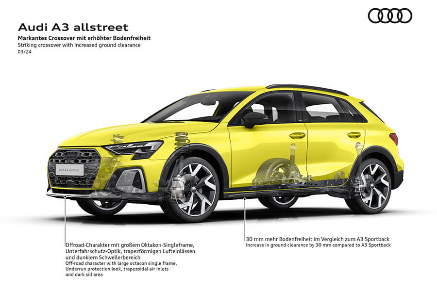 A3 allstreet懸吊高度增加1.5公分,並搭配較大的胎圈直徑,讓本車的離地間距較一般A3提升3公分,整體休旅化的感受應是不會太重,但對於日常進出車室或是在都會區裡的一些高低起伏路況可以更輕鬆穿越。