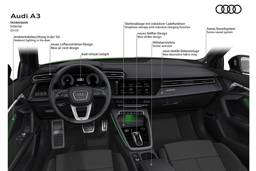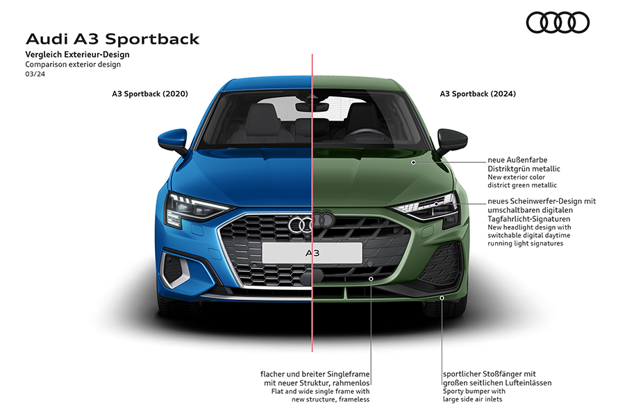 在外觀部份的調整落在頭燈組與整個前保桿與水箱罩的造型都已更一體化的造型來修飾,少了原有車型較複雜的造型堆疊,例如官方圖片中的Sportback與RS車型更類似,Sedan則有些類似現行電動車的車頭面貌。