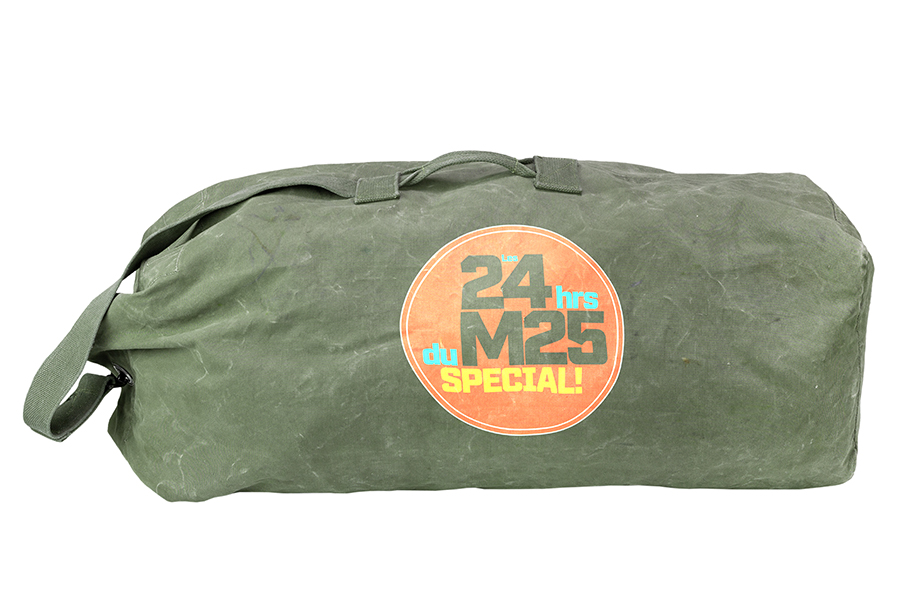 稍帶花樣圖騰、印有七八十年代賽車贊助商標的古董圓筒提袋正是完美配件,最適合放在乘客吉位