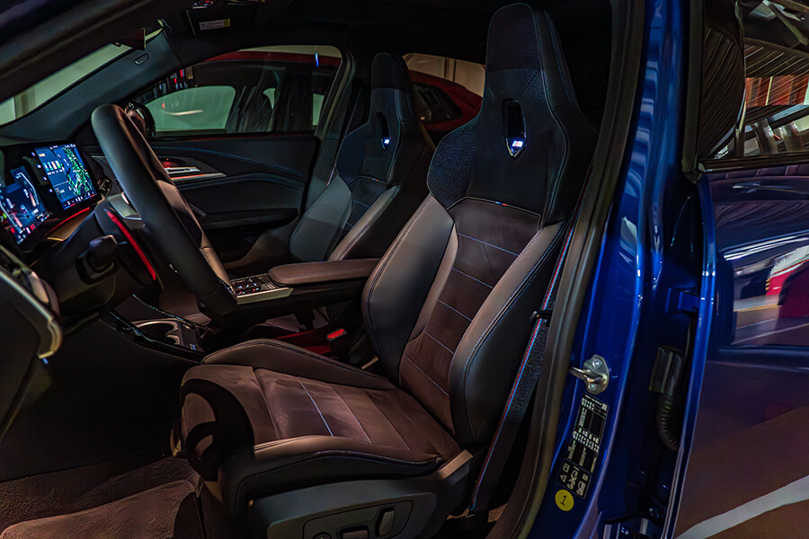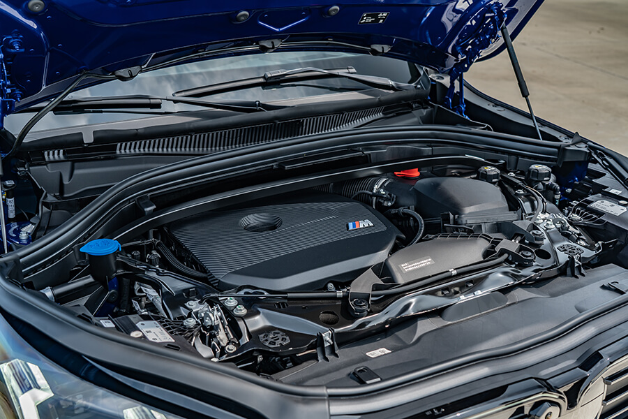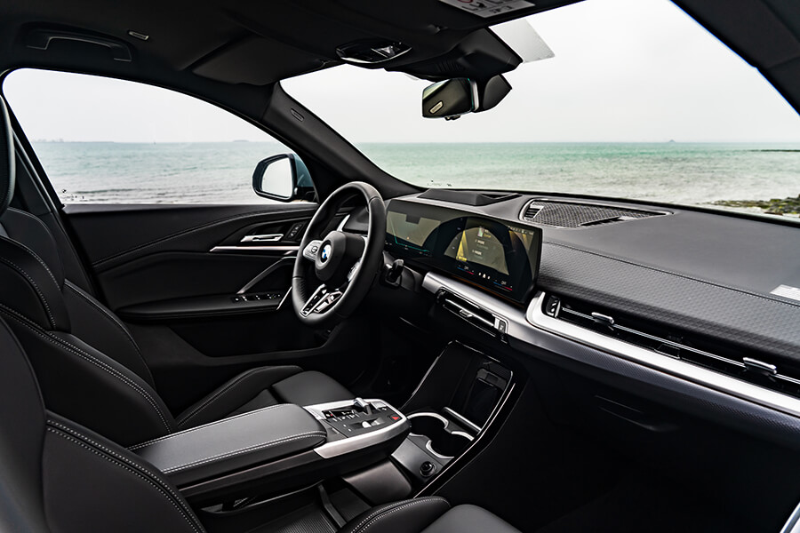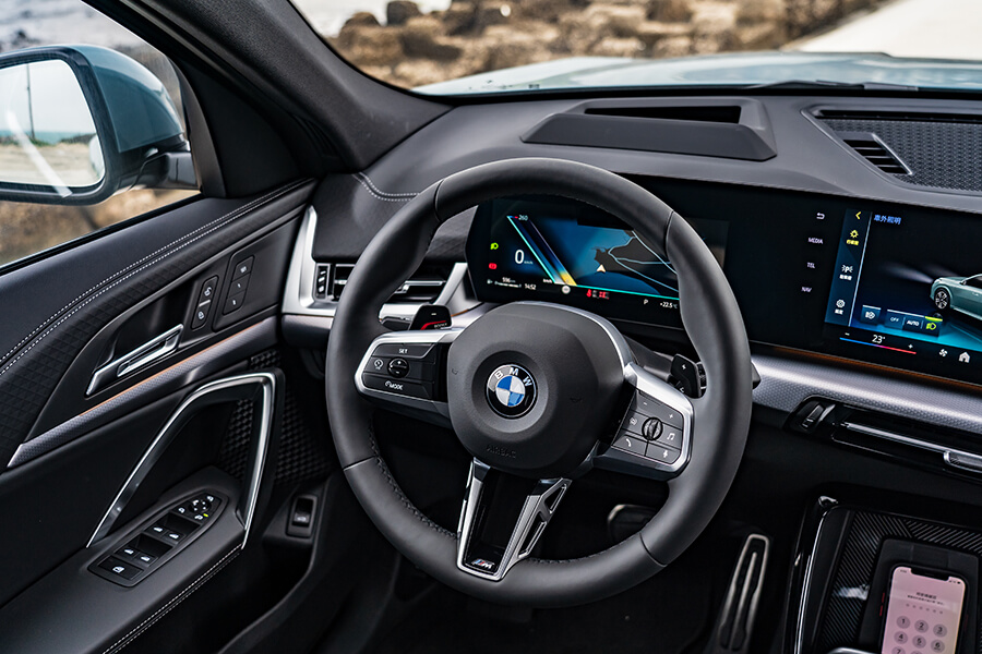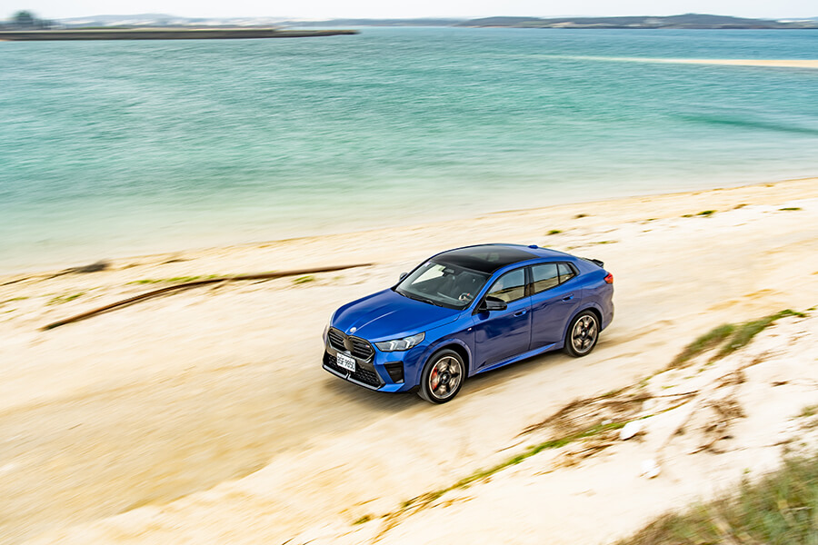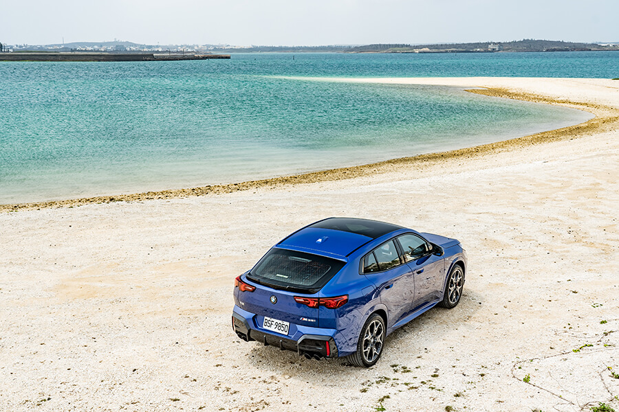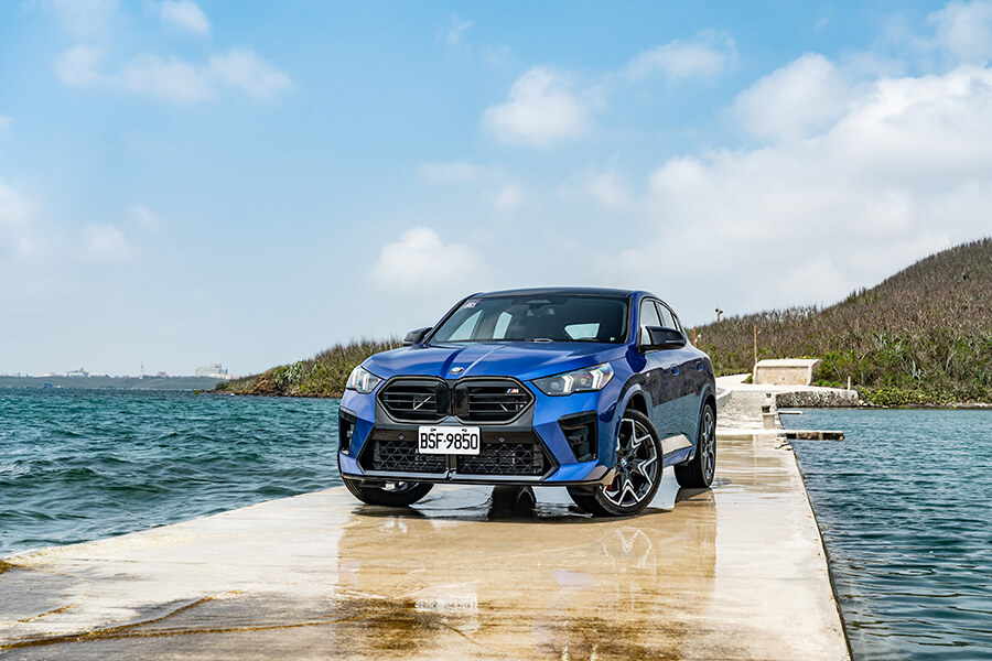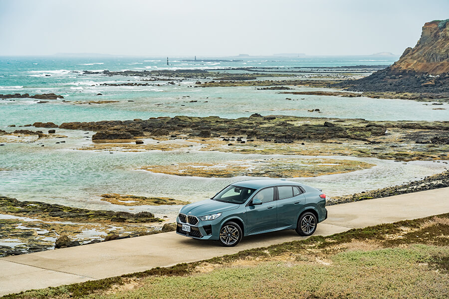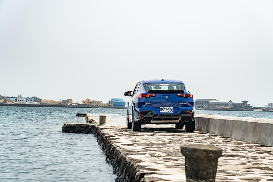 隔天換支鑰匙走入停車場,隨著鑰匙感應亮起的發光水箱與智慧LED頭燈歡迎儀式,屬於一輛身披Portimao Blue金屬烤漆的X2 M35i xDrive。透過車窗就早早看到兩張麂皮混合皮質跑車座椅上發光M字樣的誘人呼喚,Alcantara點綴的車室有Harman Kardon 的12揚聲器音響、M縫線安全帶簇擁,手中所握持的方向盤亦爬滿M三色縫線,後方換檔撥片則換上中二熱血的紅黑相間式樣。而左方的退檔撥片還有著"Boost"字樣,一旦掐住不放就會召喚出10秒的超增壓快樂時間……輕點油門,前方最大動力高達300匹的2.0直四渦輪動力就這樣中氣十足地引領我進入澎湖的艷陽。
