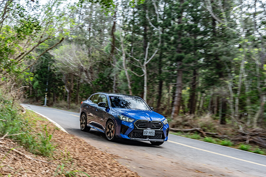 回到鋪面道路上、並切換到Sport模式,X2 M35i的出力反應又顯得更加直接,油門一點就是一股向前的拉扯感,M跑車懸吊加身的它,所配20吋M輪圈抑比起昨日sDrive20i MSport要大上一吋、車身高度略低15mm;再加上可變運動轉向系統,行起來的底盤回饋感也略顯直接乾脆。回到前一日才經過的彎道路段,當方向一指,立刻就發現側傾得到明顯的抑制。那麼再試著強施壓力呢?預期中可能出現的推頭並未出現,反倒是將車尾一擺、車頭一送,和著四顆輪胎輸出的暗中調度,逕自地以相當平衡的姿態,就這樣將路線往彎裡頭塞去。於此同時,引擎嘶吼聲與收油時的放炮聲響不絕於耳……身處在極其靜謐、僅有滾動輪胎聲響刷存在感的隔音玻璃間,腦中其實也一度懷疑自己聽到的究竟是來自內燃機的Raw sound、還是模擬音效的善意催眠,不過就在下一瞬馬上轉念:既然耳邊的抑揚頓挫,是與手中隱約傳來的震動如此口徑一致,管它的,開心就好……