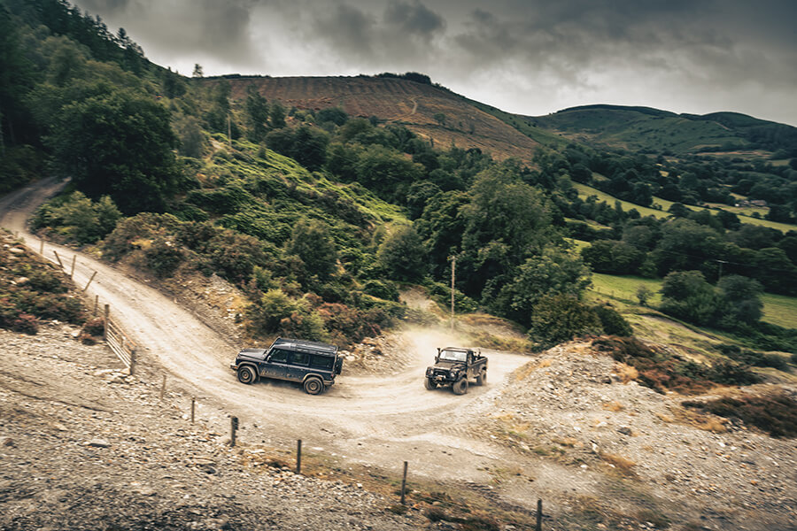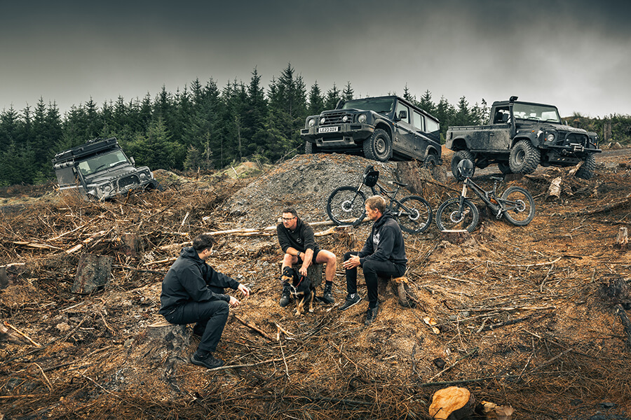 幸好我們很快便離開市區來到北威爾斯Llangynog的Revolution Bike Park,與這個場地的共同創辦人James Foster和機械高手Lee Rann會合。自從這個摩托車越野樂園啟用以來,他們便利用Defender把摩托車和裝備送上場地所在大山丘,車隊在高峰時期一度擁有十四部不同Defender,場面最熱鬧的一次總共出動了八部車。這樣說也許有點幸災樂禍,但也幸好因為附近樹林有少數樹木患病,這片場地在2023年一開始便不得不暫時關閉,但所有人馬也因此得以在這天傾巢而出濟濟一堂,通往山頂的舊路更不時有伐木機械出沒,場面熱鬧極了。
