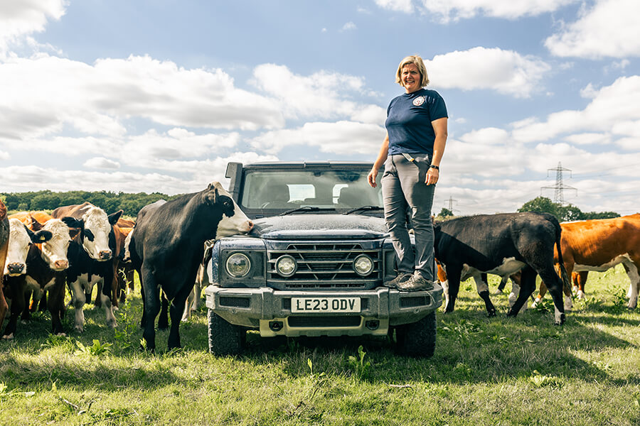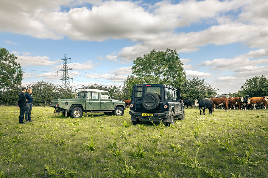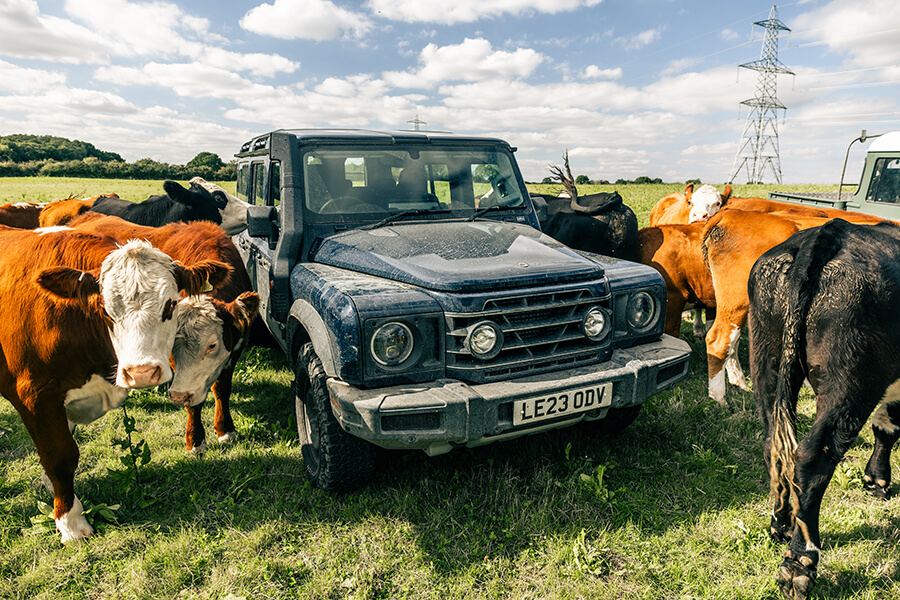 Liz Genever帶領我們去田野看看Ineos的畜牧功夫,於是我們發現自己被差不多四十頭興致勃勃的乳牛四面包圍著。這些牛牛每一條的身價約值1,500鎊,換言之加起來幾乎夠你買一部入門級雙座Grenadier Utility Wagon。