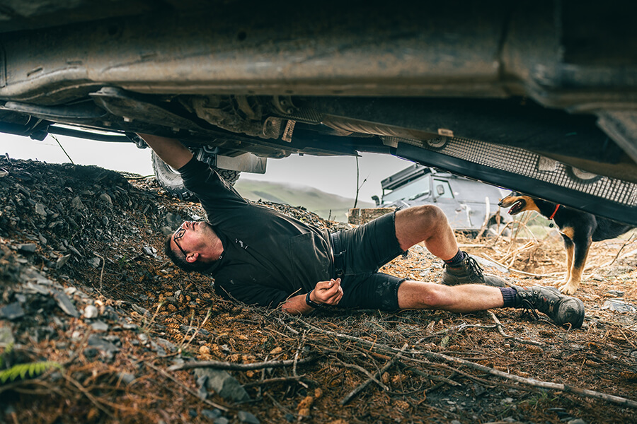 James和Lee帶來的兩部升高版Defender,最近雖然沒有甚麼工作好做,但平日仍然有好好發揮休閒越野用途。以Lee的110 Hard Top為例,便曾經往返英國和摩洛哥,其間試過闖進各式各樣無法自拔的困境。所以這部110幾乎一上陣就在樹墩陣擱淺,也許不是甚麼出乎意外的事。