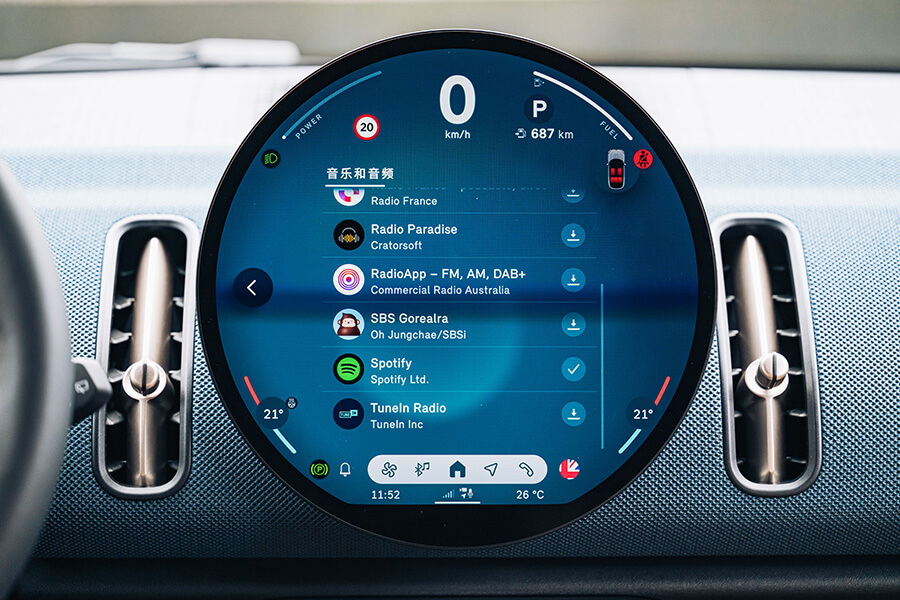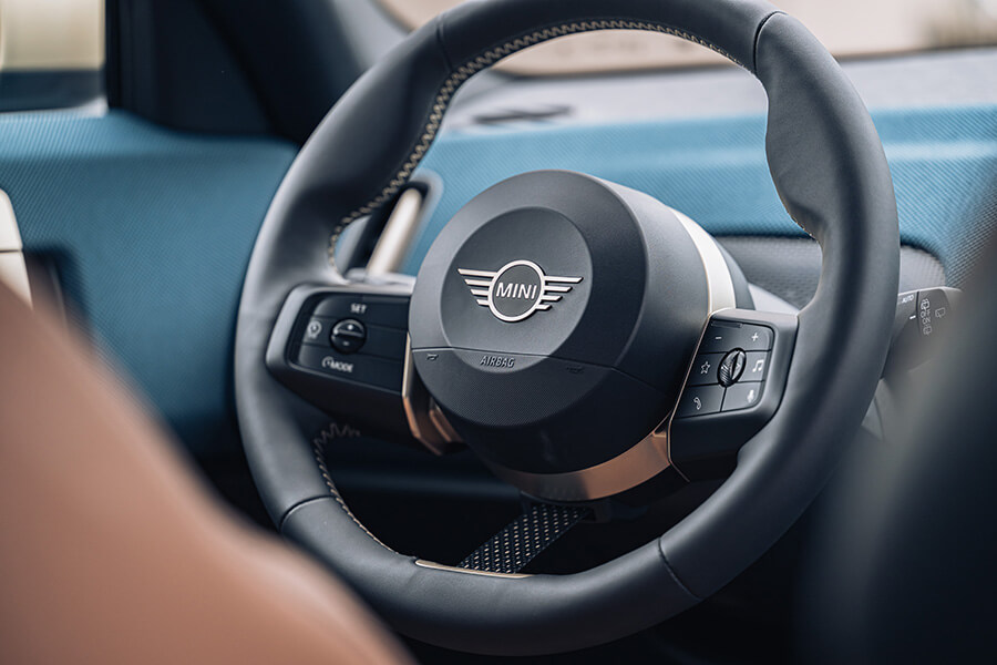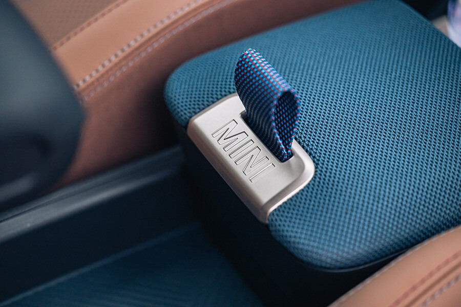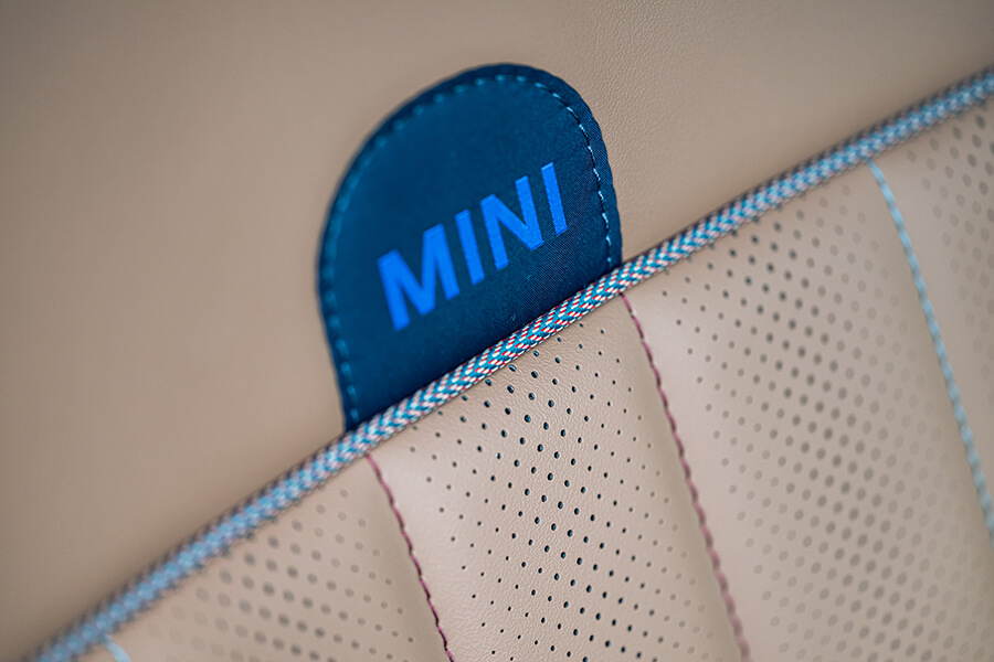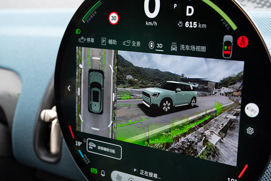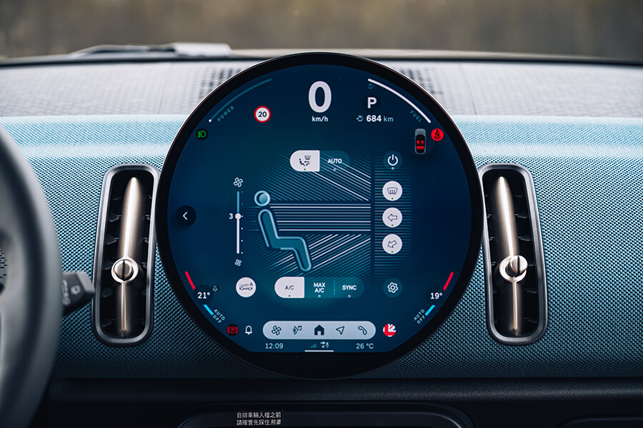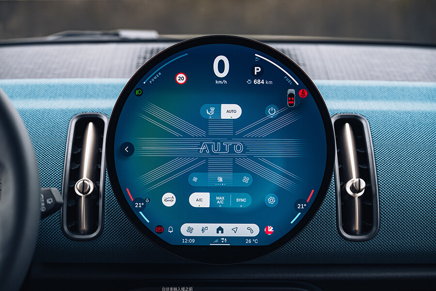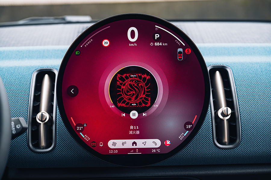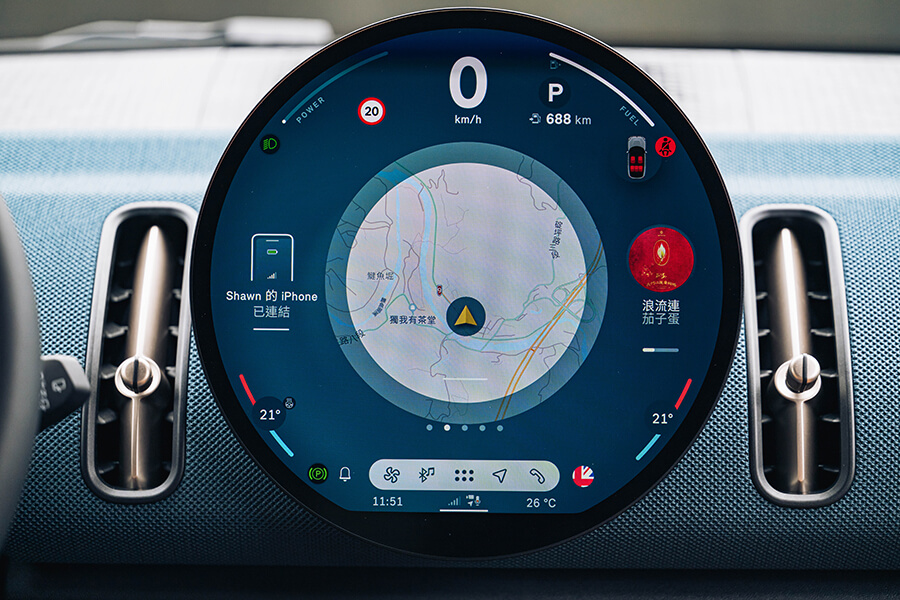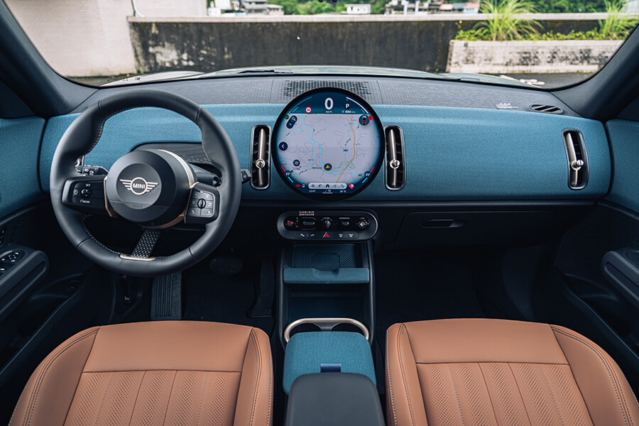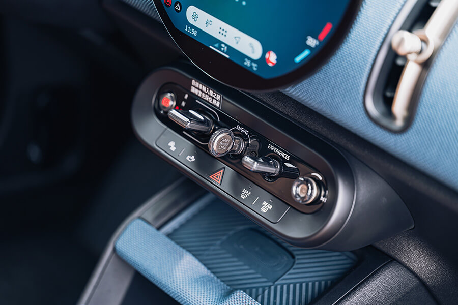視線回到駕駛座,無論是駕駛座高與肢體之於車輛內外相對位置,都好似數周前在澎湖坐上X2的體驗。但此時藍色織材的前控台、造型簡潔的冷氣出風口與+圓形OLED螢幕都帶來了截然不同的駕駛氛圍。仔細端詳,下方模擬鑰匙發動的按鈕與傳統撥桿按鍵、中央帶拉環的置物小盒,與椅面間採英國旗三色搭配的縫線亦無不充滿生活情趣。開著它走入尋常市街,透過熟悉的矮寬比例擋風玻璃看去,彷彿世界瞬間小上一號。你得要花費三至五分鐘,才會意識到其實是車身各處角落,都較舊型Mini呈比例遠離駕駛位置 。而雙掌中的小巧盤面、配上反應與距離皆相當準確的環景系統,在擁擠環境中仍然能保有輕鬆心情。