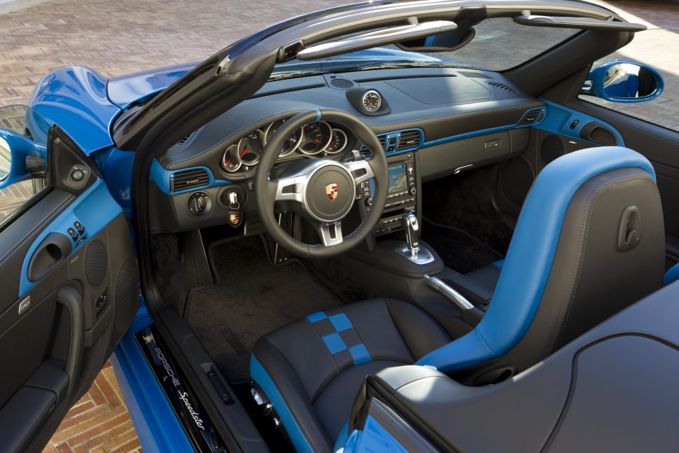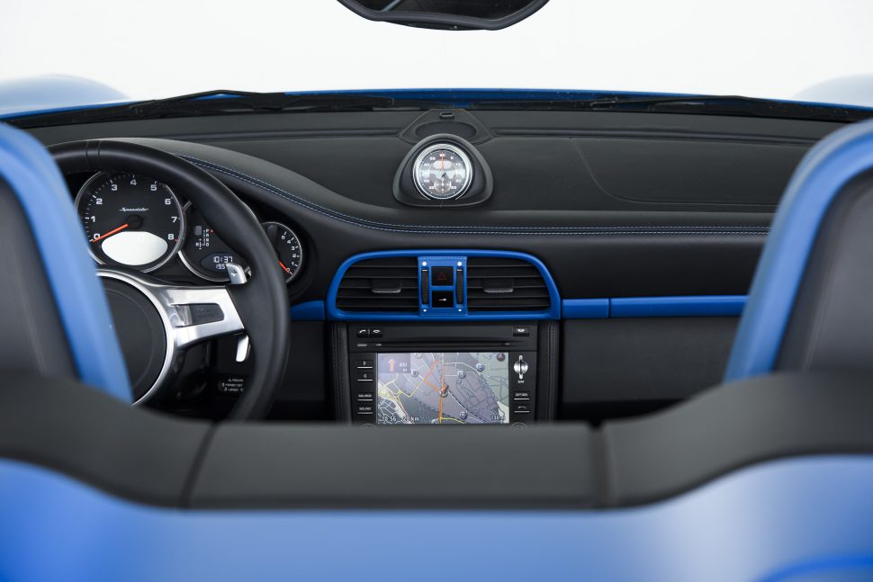 上了車,看著手煞車拉桿上頭的Speedster字樣,還有皮革座椅上的藍色方格旗圖樣及引擎轉速錶的Speedster字樣,都在提醒你這可不是一般的997,不過真正的顯著差別是997 Speedster前擋風玻璃高度降低60mm,後葉子板使用與Carrera 4 S相同的寬體鈑件,每邊多出22mm(車寬增加42mm),藉此讓後輪距加寬38mm,再搭配限滑差速器,讓997 Speedster保有豐富且靈活的操控樂趣,過彎也更穩定,讓駕駛者在不受拘束的環境中享用速度及駕馭的快樂。