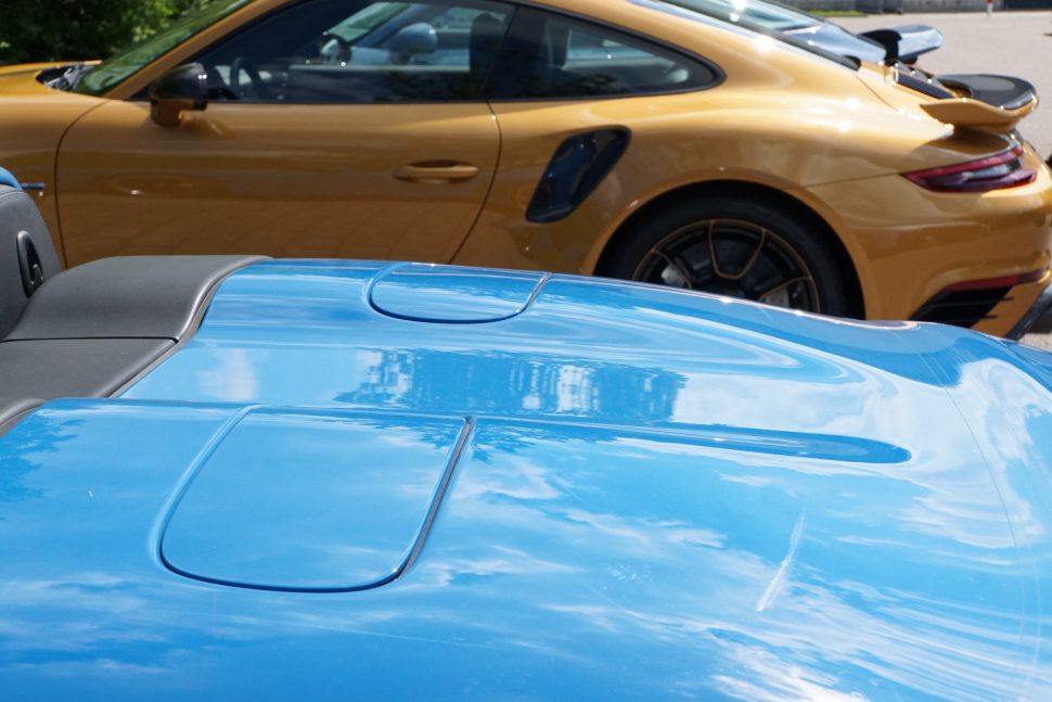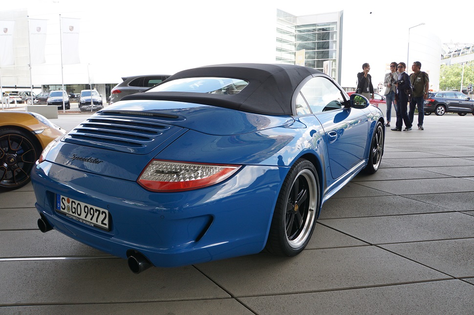 結束Porsche Exclusive Manufaktur的採訪活動,保時捷還特別安排Exclusive車款的試駕體驗,只有一個小時的試駕路程安排感覺不太過癮,但到了取車地點(博物館廣場)一下車,五、六部試駕車有幾部是991 Turbo S Exclusive Series,但當中居然包括一部藍色997 Speedster,一個箭步趨前問了工作人員,這部也是試駕車?是的!你想開這部嗎?工作人員問,我大概花了1秒鐘的時間考慮,好啊!