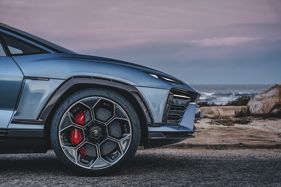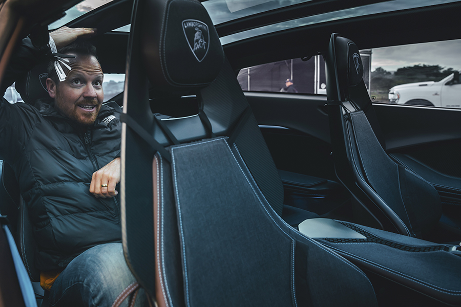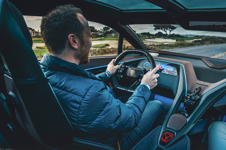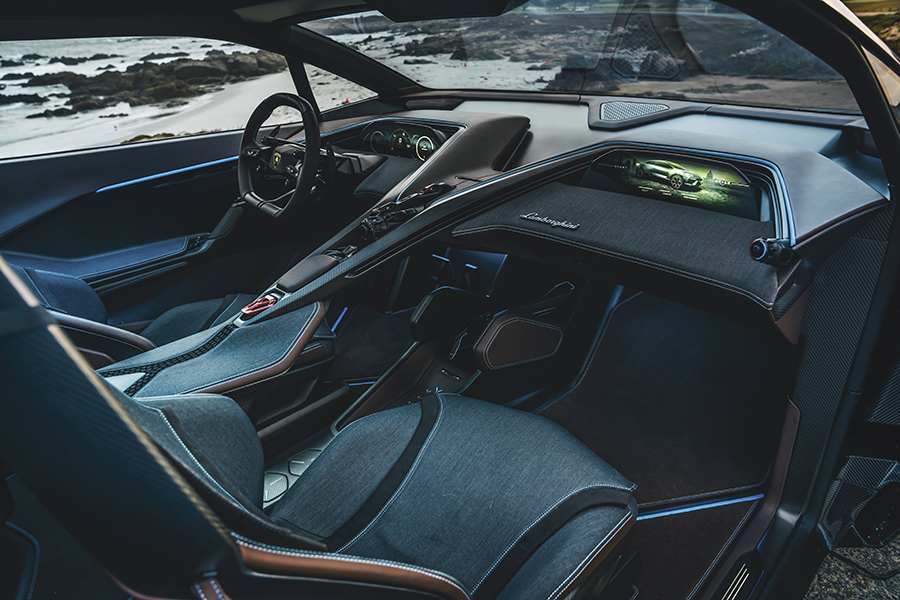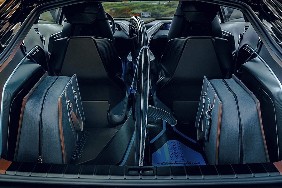 這個車廂可能是整部車上設計最激進的部分,把車門鏡顯示螢幕鑲在老遠之外的A柱底部便是相當不可理喻的做法。不過其他方面的設計倒是經過深思熟慮,只不過適度加入了一些瘋癲元素。所以你在這裏找不到中央觸控螢幕,取而代之是在方向盤後邊和乘客那邊控台分別裝有一個向下一翻便會消失的螢幕(向Countach的彈燈致意喔)。司機右手邊的控制單元貌似經過黑武士魔改後扭轉九十度角安裝的寶馬iDrive,用起來卻出乎意料順手。後座空間不如Urus寬敞,但仍然足夠讓兩名成年人一前一後坐在車廂內。尾箱地板設有電動升降功能以配合後座折疊後的高度,十分方便用家追求個人生活,所以我們亦準備了一塊衝浪板和電動滑板以備不時之需。車廂物料也值得一談,例如再造膠縫線、3D列印再造發泡膠、merino羊毛、符合可持續發展的染色皮革……老實說,如今製作概念車若非盡量運用再造物料,其實等於說自己未夠用功。