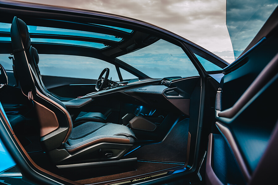 Borkert說他們設計外形時從新型Countach汲取了靈感(例如薄似剃刀的頭燈和三菱形尾燈),我輩只知道這個比較高大的伏地姿勢需要花點時間方能見怪不怪。不過這個車身至少符合林寶扁而闊的傳統特色,雖說車頭車尾和車身表面的精緻折摺未如林寶超跑那麼富有挑戰性,但與你我一向所知的林寶還是一脈相承,而且車身兩端更大膽地運用了主動整流裝置。這些裝置能夠在高速拐彎時增強壓下力,高速巡航時則會收回車身內以減低風阻和延長續航距離,當中包括了活動式車頭分流板、可以伸長的車尾導流槽、從尾窗旁邊升起的鰭翼,以及橋型尾翼。後者既能讓氣流從橋下通過以提升能源效率,亦可以封閉橋下通道以產生更多下壓力。這些設計乍聽好似概念車嘩眾取寵的花招,但或遲或早都會進入量產階段。