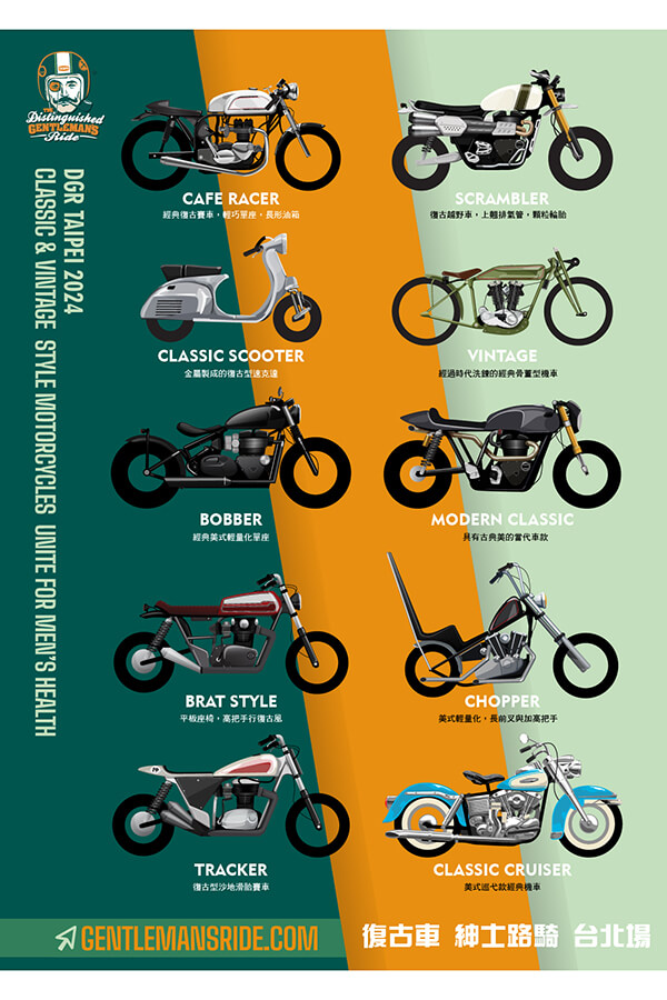 再次為新朋友們解釋一遍吧,The Distinguished Gentleman’s Ride全球慈善復古紳士路騎,源自2012年一名熱愛復古機車的澳洲騎士Mark Hawwa受到了美國影集「Med Men」(廣告狂人)的主角Don Draper穿著優雅西裝騎上古典摩托車,那美好又衝突的照片讓Mark獲得靈感。從那時開始,The Distinguished Gentleman’s Ride便成為全球騎士相約朝聖的大型聚會。DGR自發起至今,在全世界已累積121個國家、超過700個城市、34萬名以上的騎士盛情參與,並募集了約3750萬美元的慈善捐款,募得的捐款將全數由「八字鬍基金會The Movember Foundation」運用在世界具規模的前列腺癌研究、與自殺防治活動用途。