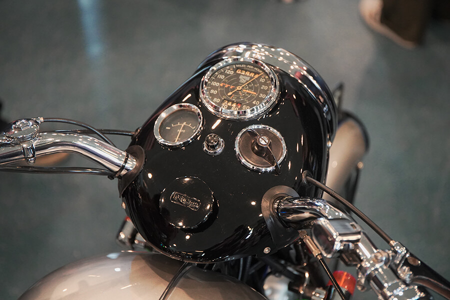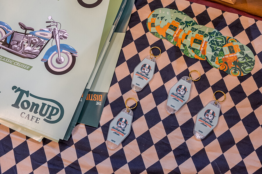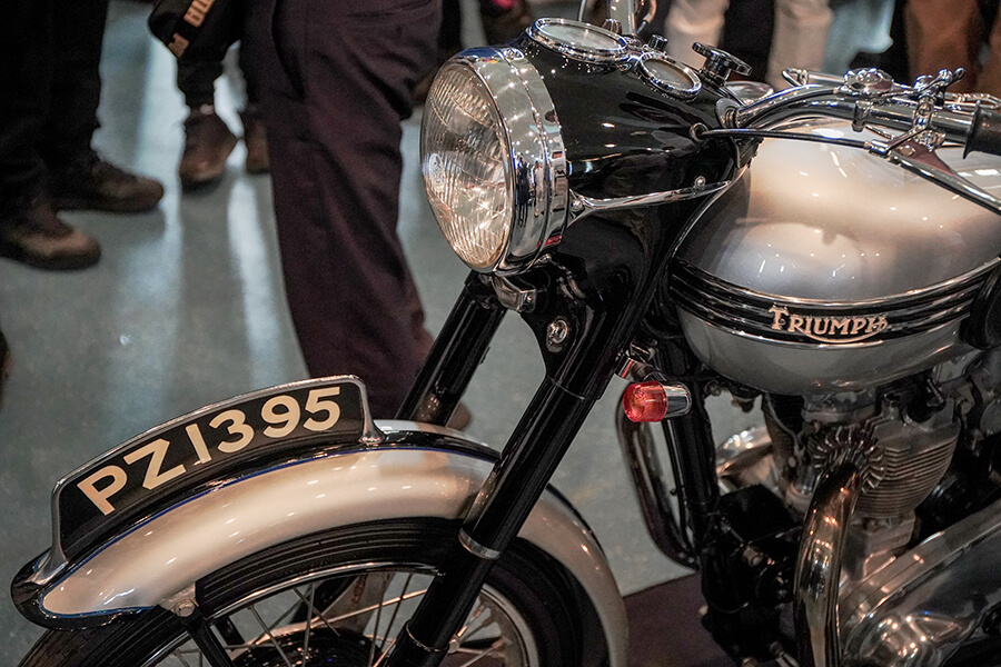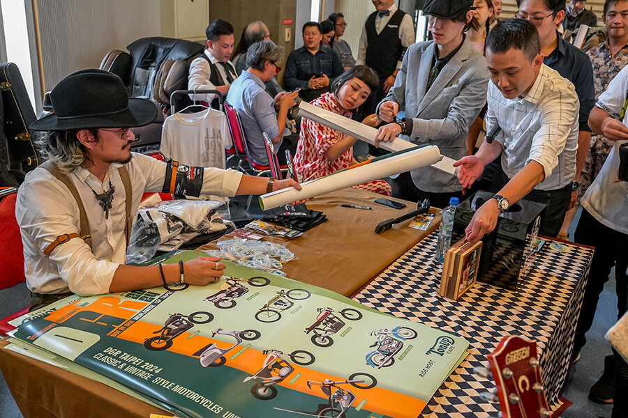 平時看來十分空曠的活動中心停車場在大隊人馬壓境下呈現滿場狀態,一旁除了已備妥各式餐車,依序來到活動背板前留念也是必須的吧!同時今年主辦單位還額外準備了1:1模型盒的合影選項,優雅充滿古典美的百頁表面質感更相當符合DGR的活動調性吶。如果這天參加人在拍完打卡照後,就以為大功告成而踏上歸途,只能說十分可惜;但應該沒有人會忽略主辦單位在室內空間規畫的展演內容:經典古董凱旋展示區召集了數台由蒐藏家提供車況極佳的1950 至1970年代古董老凱旋重機,包含: