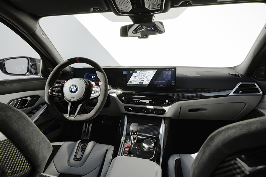 大鼻孔持續存在,2025年式M3換上了新的頭燈、鍛造合金輪圈,以及車外徽章的小幅修改。新年式M3在駕駛艙內進一步減少了實體按鍵的數量,並以OS 8.5整合大部分調整功能…總之,在諸位面前的還是一面長長的曲面螢幕,分別由12.3吋儀表、以及14.9吋觸控顯示幕所構成。儀表後方裝著新型的三幅方向盤,兩側簇擁著Sensatec儀表台、並飾以鋁質面板。當然,也可透過選配得到M碳纖維或M拉絲鋁飾板。儘管修改後的前燈與M4採用類似的造型,但有些遺憾的是尾燈並未同樣換上帶有雷射技術的尾燈。