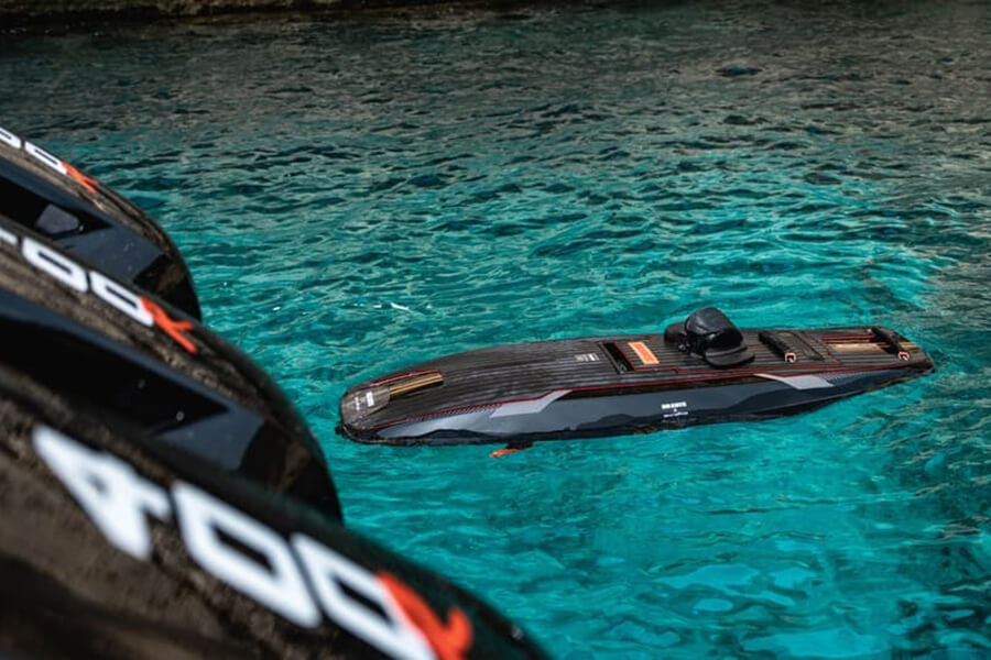 小編不太確定用”張”作為Brabus x Awake Shadow Jetboard的量詞是否精準,它的量體看起來已經不太像衝浪板,而更像是一艘小快艇。基本上此物是由Awake所製造,外觀同樣披上了Brabus招牌的黑紅塗裝、並照樣有碳纖維是面相伴,藉以彰顯這德國改裝廠家。衝浪板上有著一塊可拆卸的電池,可提供約60分鐘的續航時間,同時充電時間在兩小時內。而藉由板上具備的”低進氣噴射系統”,它可以帶著你在海面上,於三秒內加速至時速50公里,極速則約在56km/h。聽起來跟那些魔改汽車相比可能不算甚麼,但是在您孤身一人,僅有這張底部帶有碳纖維鰭片板子於海面上乘風破浪時,可能還是會感覺相當快。