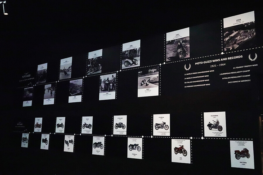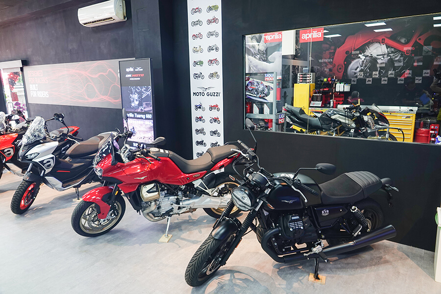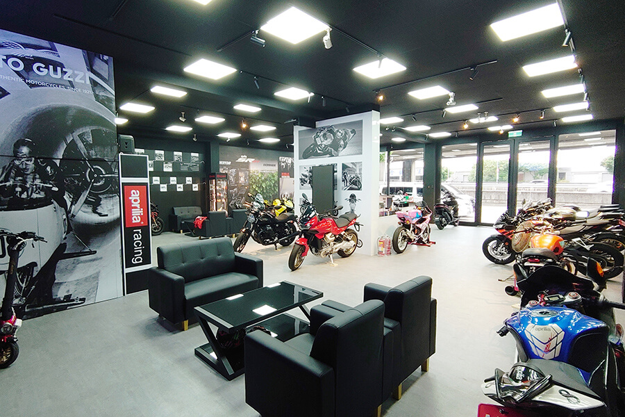 DK Moto名速車業店內遵照Piaggio集團所制定的MOTOPLEX展間視覺,黑白相間的環境用色既時尚又俐落,其中依序擺放Aprilia以及Moto Guzzi的各式車款,同時不忘規劃客休區域;從一旁的視窗看去,還能看到隔壁維修工位進行施作的過程。
