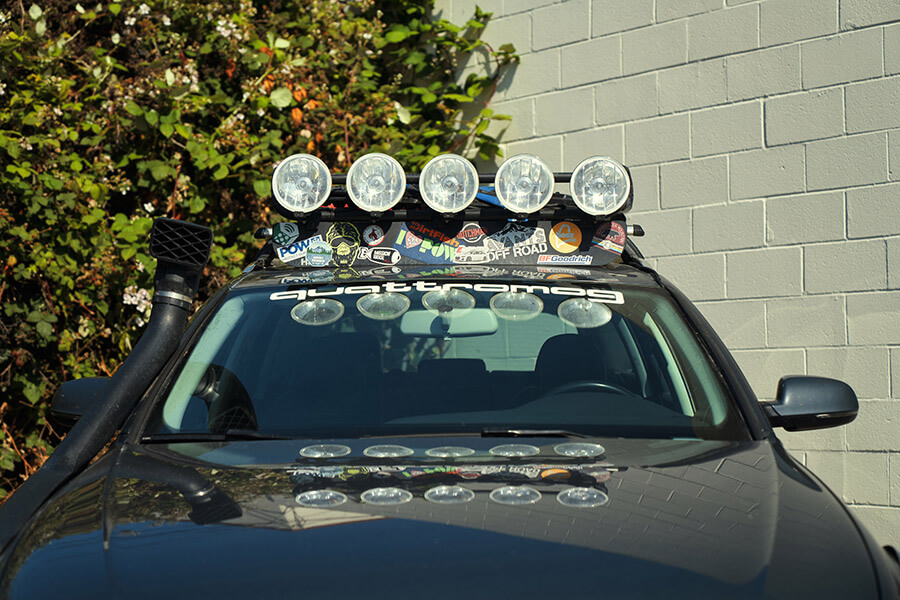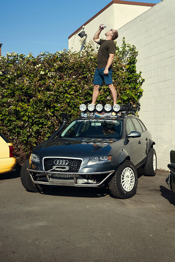 「我真的很喜歡傻呼呼的改裝計劃,孩子出世前便夢想過擁有一部懸吊特別高的奧迪。」他解釋道:「在她(RS2)機件故障期間,我們需要找地方安置那些座椅,於是我找來一部引擎損毀的報廢車。」後來這部廢車換了新引擎和特製長行程懸吊,由是變成世上最粗壯的A4,身上除了裝有大型防撞欄、絞盤和掛在車頂的喪屍碎骨斧,還有許多探險留下的疤痕戰績,簡直是精彩絕倫的怪傑。唯有在一個毋須年年驗車的國家,你才有可能用這種車作為一家人的代步工具。