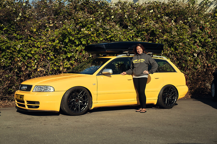 撇開芥末黃色車身不談,他的太座喜歡比較含蓄的家用車。Melissa的S4只是稍為降低了離地距,車頂扛著一個流線型行李箱。「這部車原本是我兒子的,但我真的喜歡它,所以算是據為己有吧。」做媽媽的果然挑通眼眉。