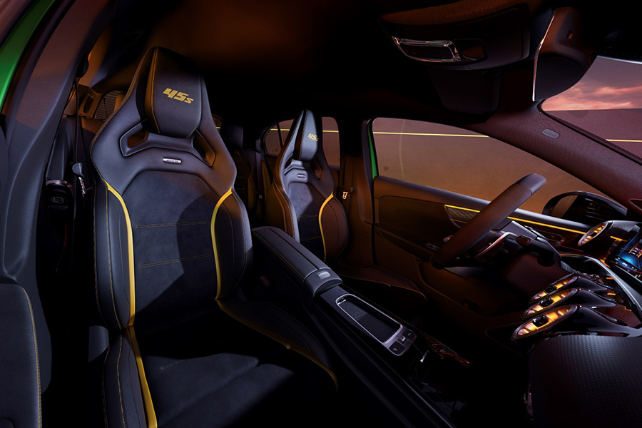Mercedes-AMG A 45 S 憑藉著地表最強直列四缸 M139 引擎壓榨出的 421hp 最大馬力,穩坐鋼砲之王寶座,今推出更具吸引力且更為張狂的進階級套件!針對 A 45 S 特別打造的 AMG Limited Edition,讓最強鋼砲增添傳奇色彩。紐柏林消光綠塗裝,搭配專屬黃黑元素車身貼飾,訴說著其與 AMG GT-R 系出同源 。19 吋 AMG Limited Edition 鍛造鋁圈則是專屬的限量配置,輕量化之餘,消光黑搭配黃色元素點綴,與車身塗裝相互呼應。夜色套件與進階夜色套件、黑色鍍鉻門把手與 AMG 專屬油箱蓋有著畫龍點睛的效果,不僅讓細節更精緻,還鋪上一層暗黑的神秘色彩。AMG 空力套件的前後擾流與進氣口鰭片,則是徹底釋放狂野本性與極致性能。