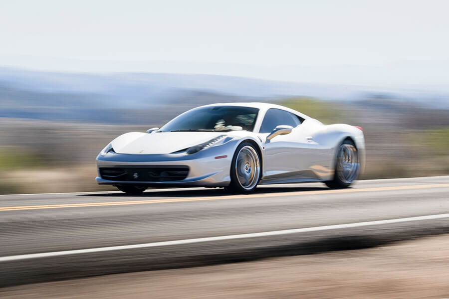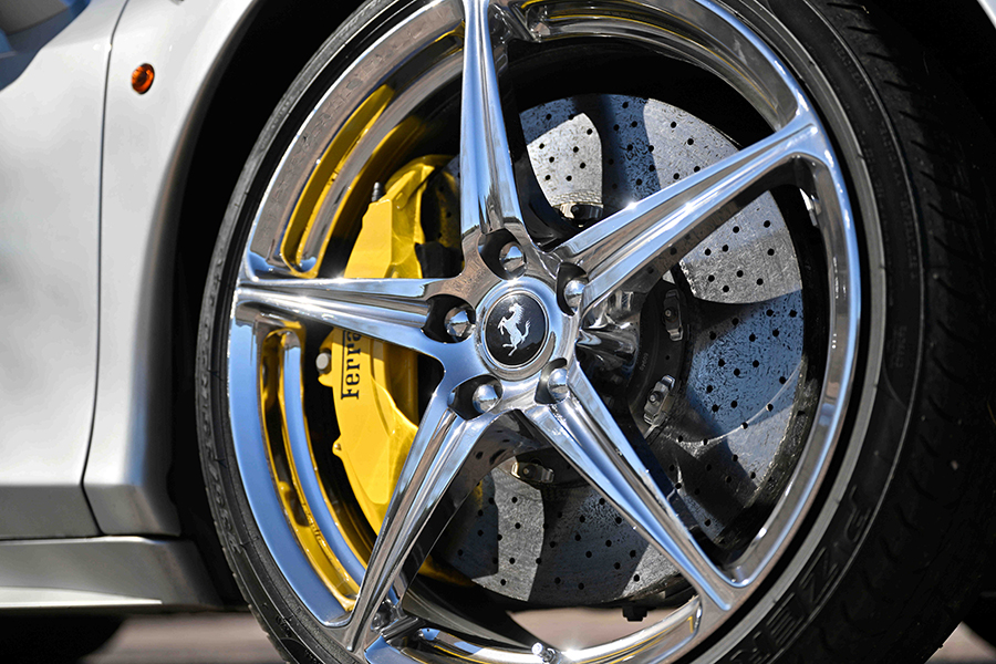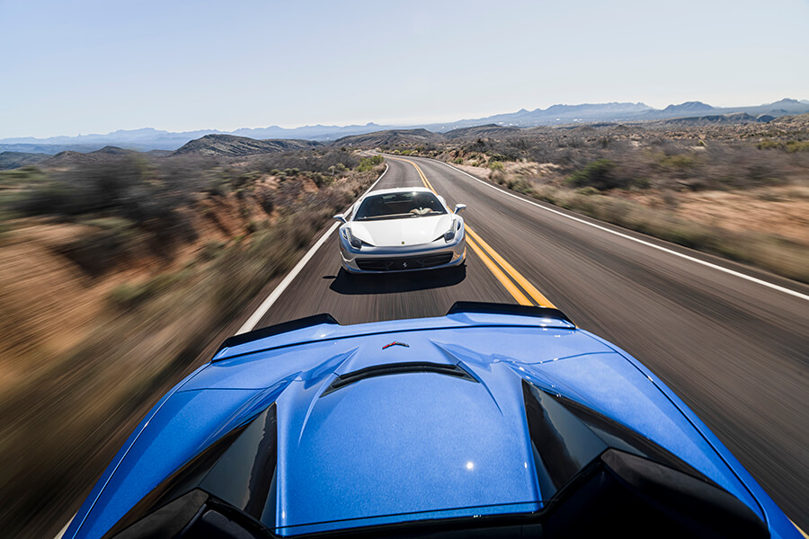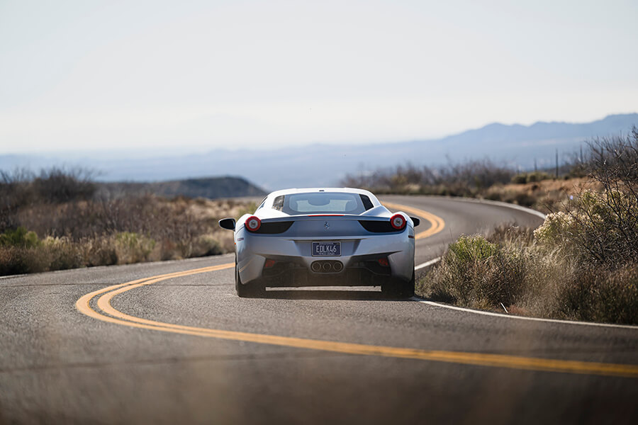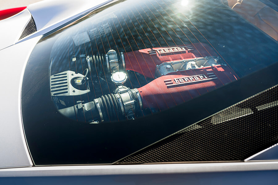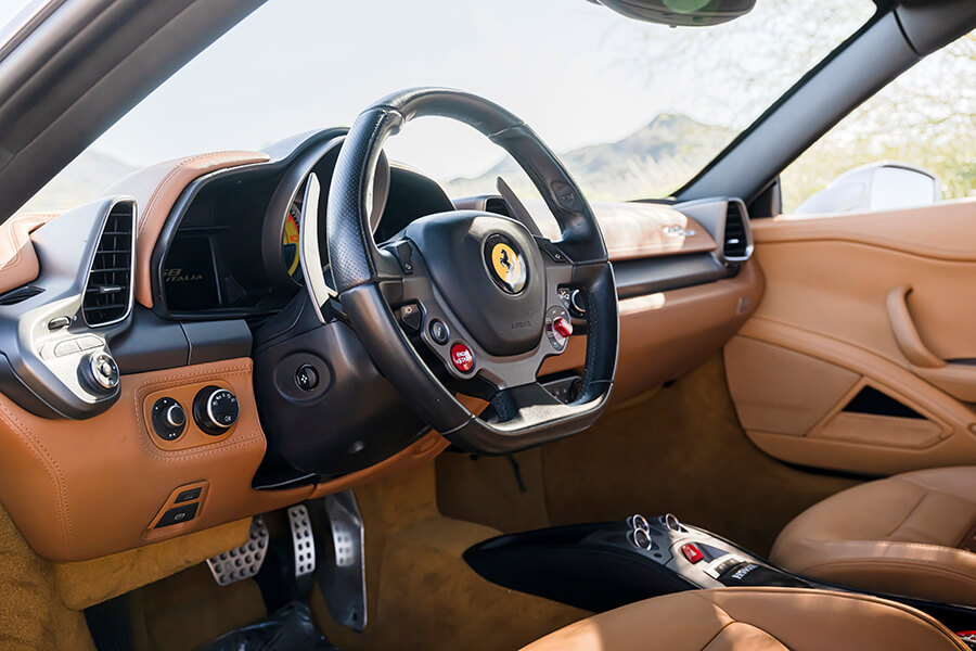 就這樣,我們獲得一個不拘一格、揉合新舊的組合。這天早上我在斯科茨代爾(Scottsdale)的法拉利代理取走458,網站上沒有顯示隨車附送兩雙鉻金屬(chrome)輪圈。「它們是前車主挑選的原廠選配項目」,銷售員搶著說,然後才跟我們介紹自己來自邁阿密,車子還有由碳纖維和鉻合金組成的徽章及極其陰沉的染黑車窗。