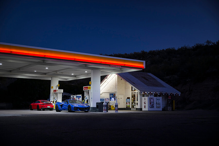 它真的好需要空間來舒展筋骨,意味大隊得前往位處鳳凰城另一邊的賽道。有關方面不允許法拉利於賽道上遊玩,因此我們打算順道途徑斯科茨代爾交還車子。我坐在法拉利後座,感受路面在我的腳跟下快速掠過,此時保時捷正於車流後方不安地擺動,而Corvette只是緩慢地行駛。它看起來很大,但似乎步履輕盈,沒有不必要的多餘動作。