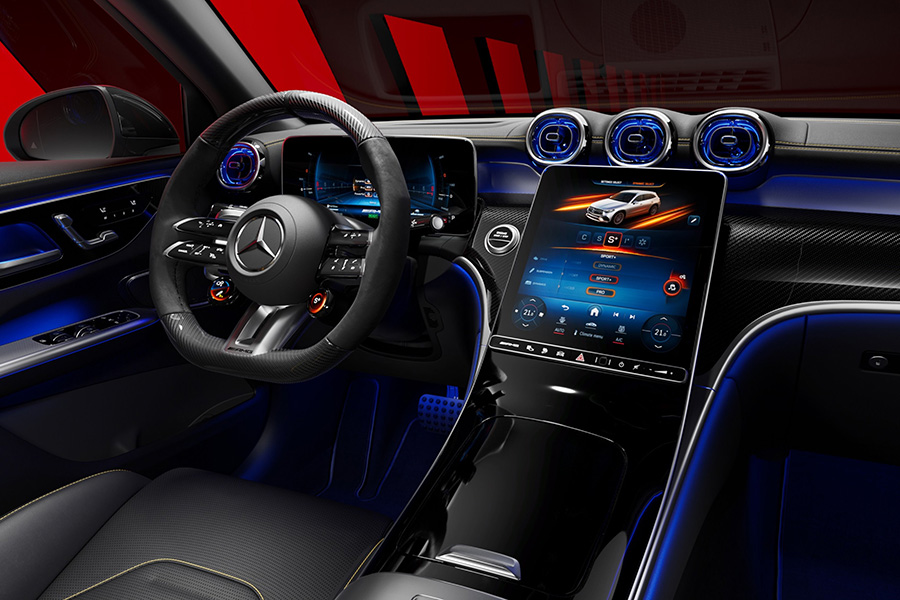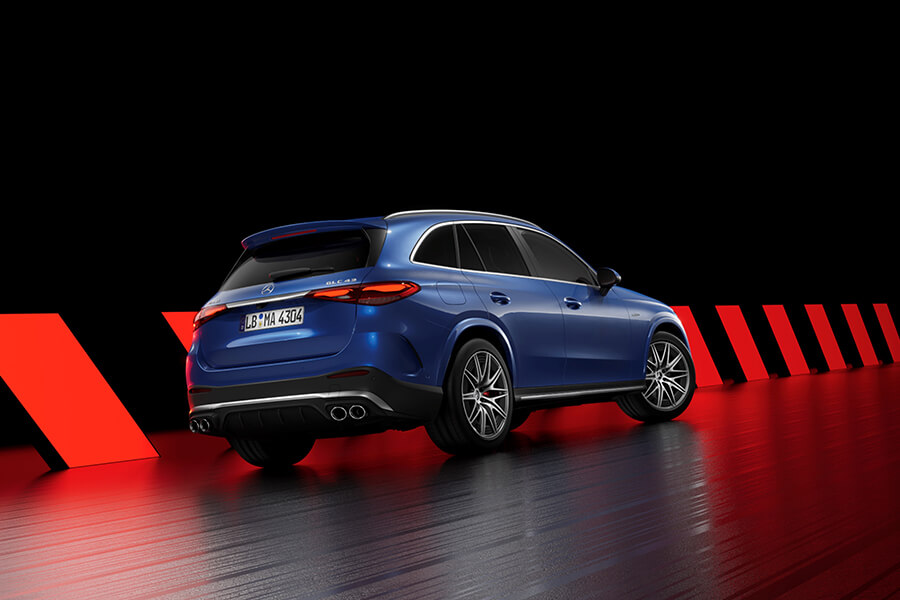 全新 GLC 43 4MATIC 運動休旅與 GLC 43 4MATIC Coupé 性能外觀設計上更添AMG熱血元素,例如指標性的直瀑式水箱護罩與上方的蘋果樹廠徽、更具張力的前後保桿設計及 AMG 尾翼,排氣管則換上雙側四出鍍鉻尾飾管。若想擁有更具侵略性的外觀,還可另外選配 AMG 造型套件 (前後下保桿導流片)、AMG 夜色套件與 AMG 碳纖維外觀套件,甚至還可升級 21 吋 AMG 輪圈,強調性能魅力。進入座艙,內裝換上更具戰鬥氣息與融合豪華質感的 AMG Nappa 真皮/MICROCUT 高性能平底跑車方向盤、 AMG 專屬方向盤操控旋鈕與 ARTICO 包覆全儀表台,搭配紅色安全帶與 AMG 專屬 MBUX 介面等細節,額外個人化選項還包含 AMG 碳纖維飾板與 AMG 高性能賽車座椅套件等,進一步彰顯運動化氛圍。