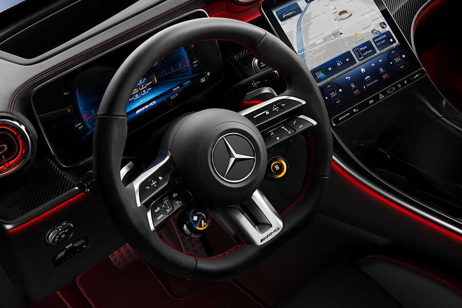 透過中控台上 11.9 吋高解析度觸控螢幕,各種移動中的需求皆可透過全新 MBUX 多媒體系統被滿足,只要說出「您好,賓士」 即可喚醒語音助理進行車輛設定調整,或是在 MBUX 擴增實境導航功能的指引下前往目的地。而搭載 Burmester® 3D 環場音響系統更打造舒適的私人娛樂間,車室空間被 15 具高傳真喇叭包圍,結合 VNC 噪音消除功能,使乘客徹底沉浸於音樂氛圍中,不受外在世界干擾,搭配環景式氛圍燈及座椅設定等,提供車主獨一無二的感官體驗,享受專屬 Mercedes-AMG 的性能豪華!