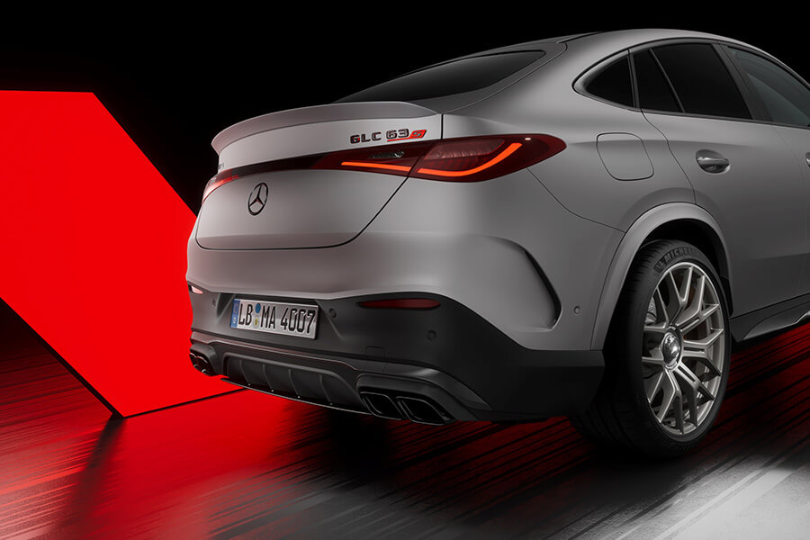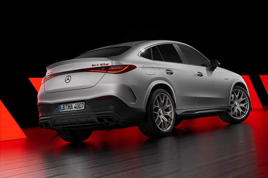 為突顯 GLC 63 S E PERFORMANCE Coupé 最速性能跑旅的地位,霸氣的鍍鉻直瀑式水箱護罩上搭載 AMG 廠徽,21 吋 AMG 專屬輪圈和 AMG 尾翼,排氣管則具狂放形象的雙側四出鍍鉻尾飾管,內裝搭載 AMG Nappa 真皮/MICROCUT 高性能平底跑車方向盤、 AMG 專屬方向盤操控旋鈕,與 AMG 專屬 MBUX 介面、Track Pace 功能等,從裡到外顯露狂暴性格。