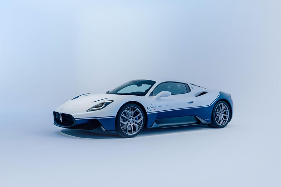 MC20 Icona 的 Bianco Audace Matte 與 Blu Stradale 的特殊塗裝包含了來自 Maserati Fuoriserie 客製化部門所創作的各項細節與獨家設計,完整呈現了訂製化的精髓。Bianco Audace 的 Maserati Fuoriserie 標誌以鮮明的顏色塗裝在側面、靠近後輪的下部位置,而義大利國旗設計則位於 MC20 車款標誌下的車門上。