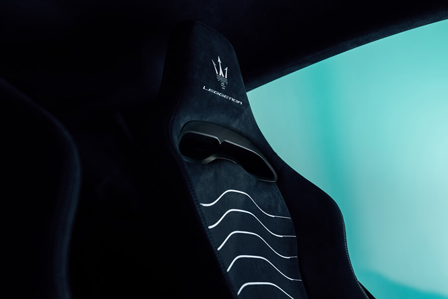 這兩款特殊限量作品的 Fuoriserie 套件還包括賽車化內裝:輕量化 4 向可調獨立式賽車座椅 —— MC20 Icona 以 Nero/Blu 藍 / 黑為座椅配色並搭配白色線條,頭枕上並繡有藍色三叉戟標誌與 Icona 車款字樣;MC20 Leggenda 的座椅則透過黑灰色搭配白色線條,頭枕上繡有白色三叉戟標誌與 Leggenda 車款字樣。