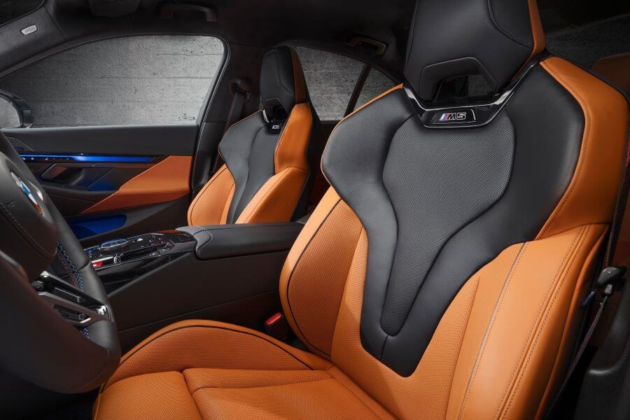 車內依舊是我們熟悉的5系列所升級而來,環境照明刻意融入M品牌三色元素,跑車座椅是這次的焦點所在,比M3或M4的碳纖維桶椅顯然有著全然不同的訴求,光用看的就能感受其兼具舒適度與支撐性的訴求,而且這次也順應潮流採用上下雙色組合。